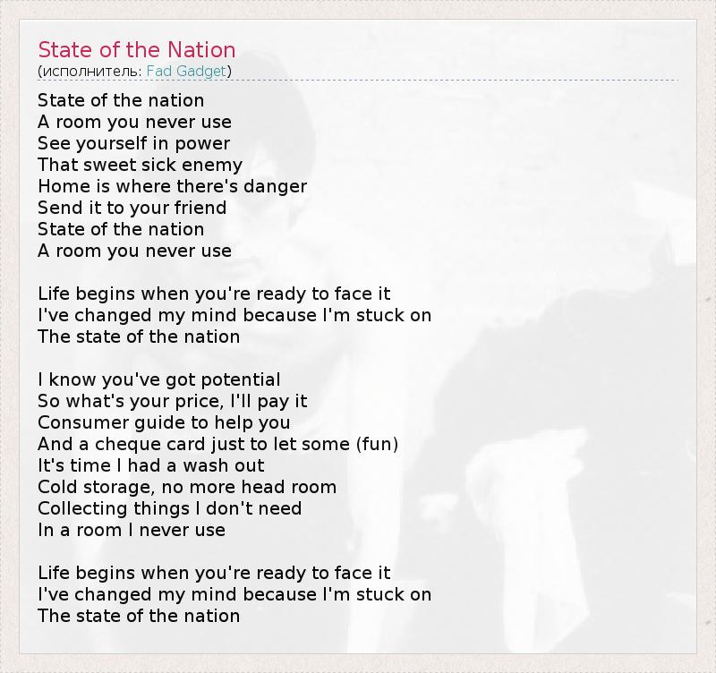 State of the nation A room you never use See yourself in power That sweet sick enemy Home is where there's danger Send it to your friend State of the nation A room you never use Life begins when you're ready to face it I've changed my mind because I'm stuck on The state of the nation I know you've got potential So what's your price, I'll pay it Consumer guide to help you And a cheque card just to let some (fun) It's time I had a wash out Cold storage, no more head room Collecting things I don't need In a room I never use Life begins when you're ready to face it I've changed my mind because I'm stuck on The state of the nation