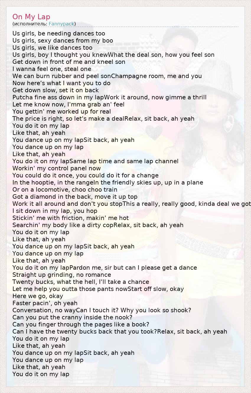 Us girls, be needing dances too Us girls, sexy dances from my boo Us girls, we like dances too Us girls, boy I thought you knewWhat the deal son, how you feel son Get down in front of me and kneel son I wanna feel one, steal one We can burn rubber and peel sonChampagne room, me and you Now here's what I want you to do Get down slow, set it on back Putcha fine ass down in my lapWork it around, now gimme a thrill Let me know now, I'mma grab an' feel You gettin' me worked up for real The price is right, so let's make a dealRelax, sit back, ah yeah You do it on my lap Like that, ah yeah You dance up on my lapSit back, ah yeah You dance up on my lap Like that, ah yeah You do it on my lapSame lap time and same lap channel Workin' my control panel now You could do it once, you could do it for a change In the hooptie, in the rangeIn the friendly skies up, up in a plane Or on a locomotive, choo choo train Got a diamond in the back, move it up top Work it all around and don't you stopThis a really, really good, kinda deal we got I sit down in my lap, you hop Stickin' me with friction, makin' me hot Searchin' my body like a dirty copRelax, sit back, ah yeah You do it on my lap Like that, ah yeah You dance up on my lapSit back, ah yeah You dance up on my lap Like that, ah yeah You do it on my lapPardon me, sir but can I please get a dance Straight up grinding, no romance Twenty bucks, what the hell, I'll take a chance Let me help you outta those pants nowStart off slow, okay Here we go, okay Faster pacin', oh yeah Conversation, no wayCan I touch it? Why you look so shook? Can you put the cranny inside the nook? Can you finger through the pages like a book? Can I have the twenty bucks back that you took?Relax, sit back, ah yeah You do it on my lap Like that, ah yeah You dance up on my lapSit back, ah yeah You dance up on my lap Like that, ah yeah You do it on my lap