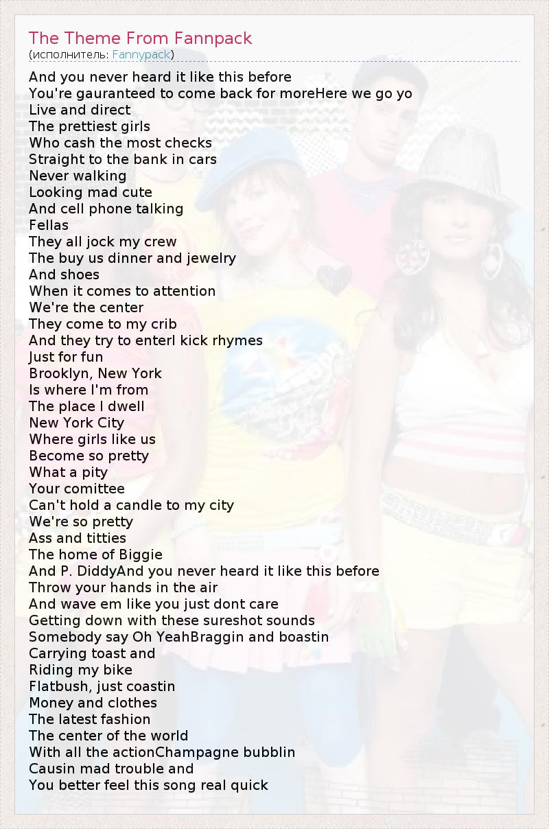 And you never heard it like this before You're gauranteed to come back for moreHere we go yo Live and direct The prettiest girls Who cash the most checks Straight to the bank in cars Never walking Looking mad cute And cell phone talking Fellas They all jock my crew The buy us dinner and jewelry And shoes When it comes to attention We're the center They come to my crib And they try to enterI kick rhymes Just for fun Brooklyn, New York Is where I'm from The place I dwell New York City Where girls like us Become so pretty What a pity Your comittee Can't hold a candle to my city We're so pretty Ass and titties The home of Biggie And P. DiddyAnd you never heard it like this before Throw your hands in the air And wave em like you just dont care Getting down with these sureshot sounds Somebody say Oh YeahBraggin and boastin Carrying toast and Riding my bike Flatbush, just coastin Money and clothes The latest fashion The center of the world With all the actionChampagne bubblin Causin mad trouble and You better feel this song real quick