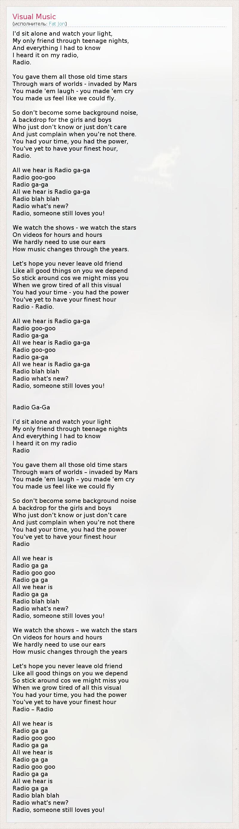 I'd sit alone and watch your light, My only friend through teenage nights, And everything I had to know I heard it on my radio, Radio. You gave them all those old time stars Through wars of worlds - invaded by Mars You made 'em laugh - you made 'em cry You made us feel like we could fly. So don't become some background noise, A backdrop for the girls and boys Who just don't know or just don't care And just complain when you're not there. You had your time, you had the power, You've yet to have your finest hour, Radio. All we hear is Radio ga-ga Radio goo-goo Radio ga-ga All we hear is Radio ga-ga Radio blah blah Radio what's new? Radio, someone still loves you! We watch the shows - we watch the stars On videos for hours and hours We hardly need to use our ears How music changes through the years. Let's hope you never leave old friend Like all good things on you we depend So stick around cos we might miss you When we grow tired of all this visual You had your time - you had the power You've yet to have your finest hour Radio - Radio. All we hear is Radio ga-ga Radio goo-goo Radio ga-ga All we hear is Radio ga-ga Radio goo-goo Radio ga-ga All we hear is Radio ga-ga Radio blah blah Radio what's new? Radio, someone still loves you! Radio Ga-Ga I'd sit alone and watch your light My only friend through teenage nights And everything I had to know I heard it on my radio Radio You gave them all those old time stars Through wars of worlds – invaded by Mars You made 'em laugh – you made 'em cry You made us feel like we could fly So don't become some background noise A backdrop for the girls and boys Who just don't know or just don't care And just complain when you're not there You had your time, you had the power You've yet to have your finest hour Radio All we hear is Radio ga ga Radio goo goo Radio ga ga All we hear is Radio ga ga Radio blah blah Radio what's new? Radio, someone still loves you! We watch the shows – we watch the stars On videos for hours and hours We hardly need to use our ears How music changes through the years Let's hope you never leave old friend Like all good things on you we depend So stick around cos we might miss you When we grow tired of all this visual You had your time, you had the power You've yet to have your finest hour Radio – Radio All we hear is Radio ga ga Radio goo goo Radio ga ga All we hear is Radio ga ga Radio goo goo Radio ga ga All we hear is Radio ga ga Radio blah blah Radio what's new? Radio, someone still loves you!