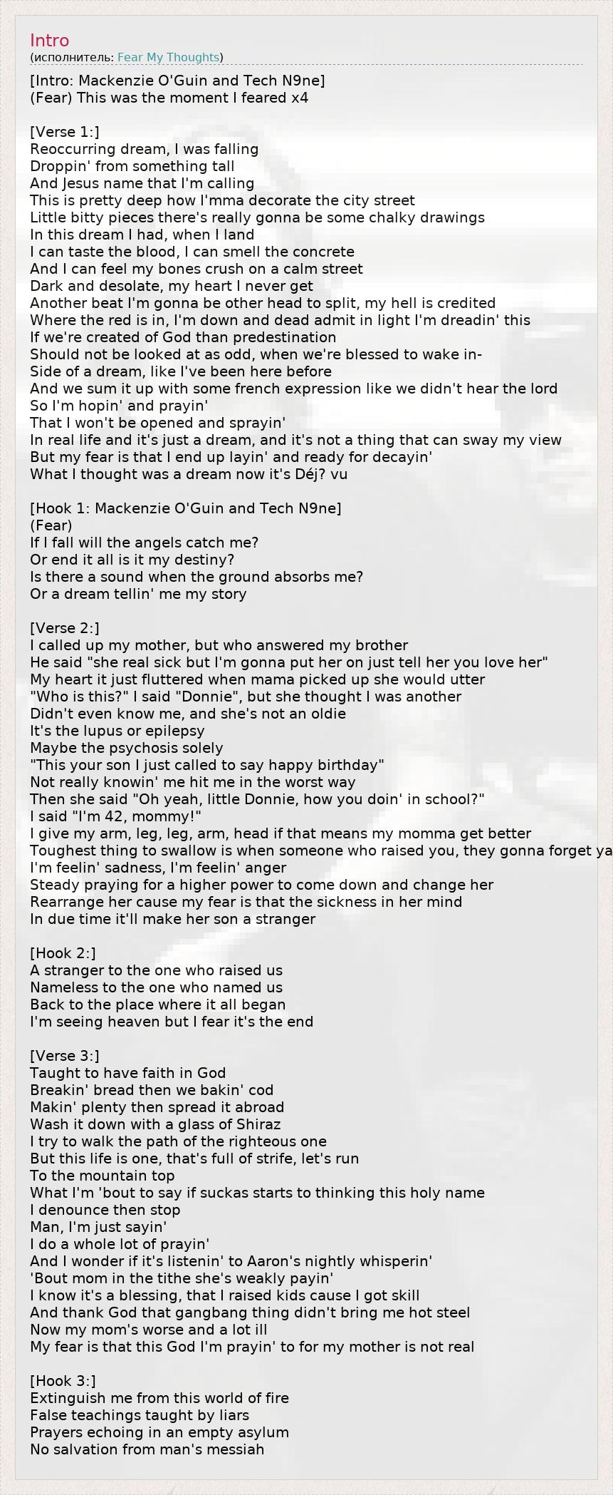 [Intro: Mackenzie O'Guin and Tech N9ne] (Fear) This was the moment I feared x4 [Verse 1:] Reoccurring dream, I was falling Droppin' from something tall And Jesus name that I'm calling This is pretty deep how I'mma decorate the city street Little bitty pieces there's really gonna be some chalky drawings In this dream I had, when I land I can taste the blood, I can smell the concrete And I can feel my bones crush on a calm street Dark and desolate, my heart I never get Another beat I'm gonna be other head to split, my hell is credited Where the red is in, I'm down and dead admit in light I'm dreadin' this If we're created of God than predestination Should not be looked at as odd, when we're blessed to wake in- Side of a dream, like I've been here before And we sum it up with some french expression like we didn't hear the lord So I'm hopin' and prayin' That I won't be opened and sprayin' In real life and it's just a dream, and it's not a thing that can sway my view But my fear is that I end up layin' and ready for decayin' What I thought was a dream now it's Déj? vu [Hook 1: Mackenzie O'Guin and Tech N9ne] (Fear) If I fall will the angels catch me? Or end it all is it my destiny? Is there a sound when the ground absorbs me? Or a dream tellin' me my story [Verse 2:] I called up my mother, but who answered my brother He said "she real sick but I'm gonna put her on just tell her you love her" My heart it just fluttered when mama picked up she would utter "Who is this?" I said "Donnie", but she thought I was another Didn't even know me, and she's not an oldie It's the lupus or epilepsy Maybe the psychosis solely "This your son I just called to say happy birthday" Not really knowin' me hit me in the worst way Then she said "Oh yeah, little Donnie, how you doin' in school?" I said "I'm 42, mommy!" I give my arm, leg, leg, arm, head if that means my momma get better Toughest thing to swallow is when someone who raised you, they gonna forget ya I'm feelin' sadness, I'm feelin' anger Steady praying for a higher power to come down and change her Rearrange her cause my fear is that the sickness in her mind In due time it'll make her son a stranger [Hook 2:] A stranger to the one who raised us Nameless to the one who named us Back to the place where it all began I'm seeing heaven but I fear it's the end [Verse 3:] Taught to have faith in God Breakin' bread then we bakin' cod Makin' plenty then spread it abroad Wash it down with a glass of Shiraz I try to walk the path of the righteous one But this life is one, that's full of strife, let's run To the mountain top What I'm 'bout to say if suckas starts to thinking this holy name I denounce then stop Man, I'm just sayin' I do a whole lot of prayin' And I wonder if it's listenin' to Aaron's nightly whisperin' 'Bout mom in the tithe she's weakly payin' I know it's a blessing, that I raised kids cause I got skill And thank God that gangbang thing didn't bring me hot steel Now my mom's worse and a lot ill My fear is that this God I'm prayin' to for my mother is not real [Hook 3:] Extinguish me from this world of fire False teachings taught by liars Prayers echoing in an empty asylum No salvation from man's messiah
