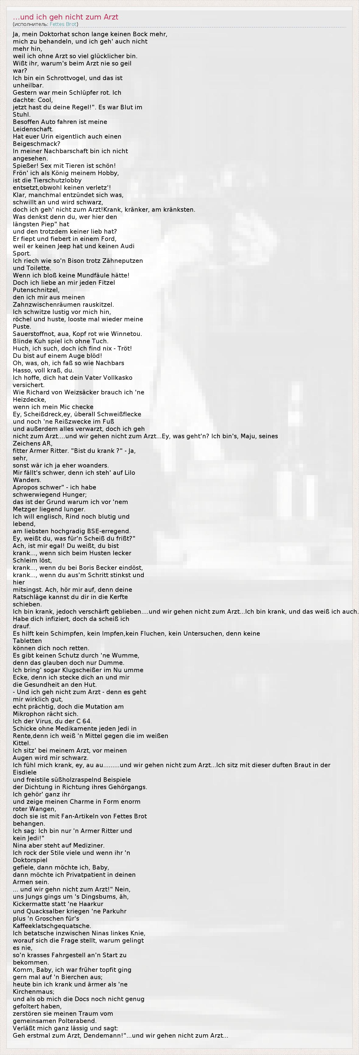 Ja, mein Doktorhat schon lange keinen Bock mehr, mich zu behandeln, und ich geh' auch nicht mehr hin, weil ich ohne Arzt so viel glücklicher bin. Wißt ihr, warum's beim Arzt nie so geil war? Ich bin ein Schrottvogel, und das ist unheilbar. Gestern war mein Schlüpfer rot. Ich dachte: Cool, jetzt hast du deine Regel!". Es war Blut im Stuhl. Besoffen Auto fahren ist meine Leidenschaft. Hat euer Urin eigentlich auch einen Beigeschmack? In meiner Nachbarschaft bin ich nicht angesehen. Spießer! Sex mit Tieren ist schön! Frön' ich als König meinem Hobby, ist die Tierschutzlobby entsetzt,obwohl keinen verletz'! Klar, manchmal entzündet sich was, schwillt an und wird schwarz, doch ich geh' nicht zum Arzt!Krank, kränker, am kränksten. Was denkst denn du, wer hier den längsten Piep" hat und den trotzdem keiner lieb hat? Er fiept und fiebert in einem Ford, weil er keinen Jeep hat und keinen Audi Sport. Ich riech wie so'n Bison trotz Zähneputzen und Toilette. Wenn ich bloß keine Mundfäule hätte! Doch ich liebe an mir jeden Fitzel Putenschnitzel, den ich mir aus meinen Zahnzwischenräumen rauskitzel. Ich schwitze lustig vor mich hin, röchel und huste, looste mal wieder meine Puste. Sauerstoffnot, aua, Kopf rot wie Winnetou. Blinde Kuh spiel ich ohne Tuch. Huch, ich such, doch ich find nix - Tröt! Du bist auf einem Auge blöd! Oh, was, oh, ich faß so wie Nachbars Hasso, voll kraß, du. Ich hoffe, dich hat dein Vater Vollkasko versichert. Wie Richard von Weizsäcker brauch ich 'ne Heizdecke, wenn ich mein Mic checke Ey, Scheißdreck,ey, überall Schweißflecke und noch 'ne Reißzwecke im Fuß und außerdem alles verwarzt, doch ich geh nicht zum Arzt....und wir gehen nicht zum Arzt...Ey, was geht'n? Ich bin's, Maju, seines Zeichens AR, fitter Armer Ritter. "Bist du krank ?" - Ja, sehr, sonst wär ich ja eher woanders. Mir fällt's schwer, denn ich steh' auf Lilo Wanders. Apropos schwer" - ich habe schwerwiegend Hunger; das ist der Grund warum ich vor 'nem Metzger liegend lunger. Ich will englisch, Rind noch blutig und lebend, am liebsten hochgradig BSE-erregend. Ey, weißt du, was für'n Scheiß du frißt?" Ach, ist mir egal! Du weißt, du bist krank..., wenn sich beim Husten lecker Schleim löst, krank..., wenn du bei Boris Becker eindöst, krank..., wenn du aus'm Schritt stinkst und hier mitsingst. Ach, hör mir auf, denn deine Ratschläge kannst du dir in die Kerfte schieben. Ich bin krank, jedoch verschärft geblieben....und wir gehen nicht zum Arzt...Ich bin krank, und das weiß ich auch. Habe dich infiziert, doch da scheiß ich drauf. Es hilft kein Schimpfen, kein Impfen,kein Fluchen, kein Untersuchen, denn keine Tabletten können dich noch retten. Es gibt keinen Schutz durch 'ne Wumme, denn das glauben doch nur Dumme. Ich bring' sogar Klugscheißer im Nu umme Ecke, denn ich stecke dich an und mir die Gesundheit an den Hut. - Und ich geh nicht zum Arzt - denn es geht mir wirklich gut, echt prächtig, doch die Mutation am Mikrophon rächt sich. Ich der Virus, du der C 64. Schicke ohne Medikamente jeden Jedi in Rente,denn ich weiß 'n Mittel gegen die im weißen Kittel. Ich sitz' bei meinem Arzt, vor meinen Augen wird mir schwarz. Ich fühl mich krank, ey, au au.........und wir gehen nicht zum Arzt...Ich sitz mit dieser duften Braut in der Eisdiele und freistile süßholzraspelnd Beispiele der Dichtung in Richtung ihres Gehörgangs. Ich gehör' ganz ihr und zeige meinen Charme in Form enorm roter Wangen, doch sie ist mit Fan-Artikeln von Fettes Brot behangen. Ich sag: Ich bin nur 'n Armer Ritter und kein Jedi!" Nina aber steht auf Mediziner. Ich rock der Stile viele und wenn ihr 'n Doktorspiel gefiele, dann möchte ich, Baby, dann möchte ich Privatpatient in deinen Armen sein. ... und wir gehn nicht zum Arzt!" Nein, uns Jungs gings um 's Dingsbums, äh, Kickermatte statt 'ne Haarkur und Quacksalber kriegen 'ne Parkuhr plus 'n Groschen für's Kaffeeklatschgequatsche. Ich betatsche inzwischen Ninas linkes Knie, worauf sich die Frage stellt, warum gelingt es nie, so'n krasses Fahrgestell an'n Start zu bekommen. Komm, Baby, ich war früher topfit ging gern mal auf 'n Bierchen aus; heute bin ich krank und ärmer als 'ne Kirchenmaus; und als ob mich die Docs noch nicht genug gefoltert haben, zerstören sie meinen Traum vom gemeinsamen Polterabend. Verläßt mich ganz lässig und sagt: Geh erstmal zum Arzt, Dendemann!"...und wir gehen nicht zum Arzt...
