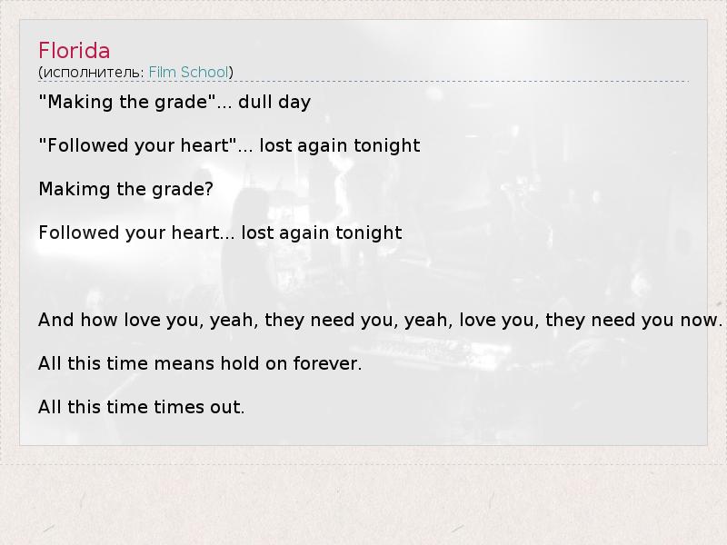 "Making the grade"... dull day "Followed your heart"... lost again tonight Makimg the grade? Followed your heart... lost again tonight And how love you, yeah, they need you, yeah, love you, they need you now. All this time means hold on forever. All this time times out.