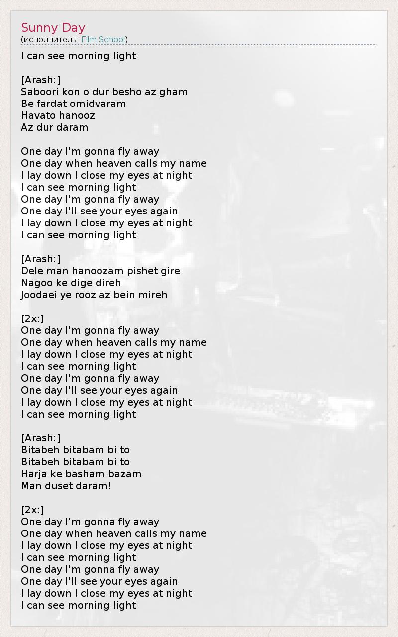 Я вижу луну и свет. [Arash:] Наберись терпения и забудь о всех печалях, Мне видится твоё счастливое будущее. Я продолжаю о тебе заботиться, Хотя я далеко от тебя... В один прекрасный день я улечу, Однажды, когда небо позовёт меня по имени... Ночью я ложусь, закрываю глаза И вижу утренний свет. В один прекрасный день я улечу, Однажды я снова посмотрю в твои глаза. Ночью я ложусь, закрываю глаза И вижу утренний свет. [Arash:] Я всё ещё люблю тебя, Не говори, что слишком поздно. Однажды этой разлуке придёт конец... [2x:] В один прекрасный день я улечу, Однажды, когда небо позовёт меня по имени... Ночью я ложусь, закрываю глаза И вижу утренний свет. В один прекрасный день я улечу, Однажды я снова посмотрю в твои глаза. Ночью я ложусь, закрываю глаза И вижу утренний свет. [Arash:] Без тебя мне нет покоя, Без тебя мне нет покоя. Куда бы я ни пошёл, Я до конца буду любить тебя... [2x:] В один прекрасный день я улечу, Однажды, когда небо позовёт меня по имени... Ночью я ложусь, закрываю глаза И вижу утренний свет. В один прекрасный день я улечу, Однажды я снова посмотрю в твои глаза. Ночью я ложусь, закрываю глаза И вижу утренний свет.