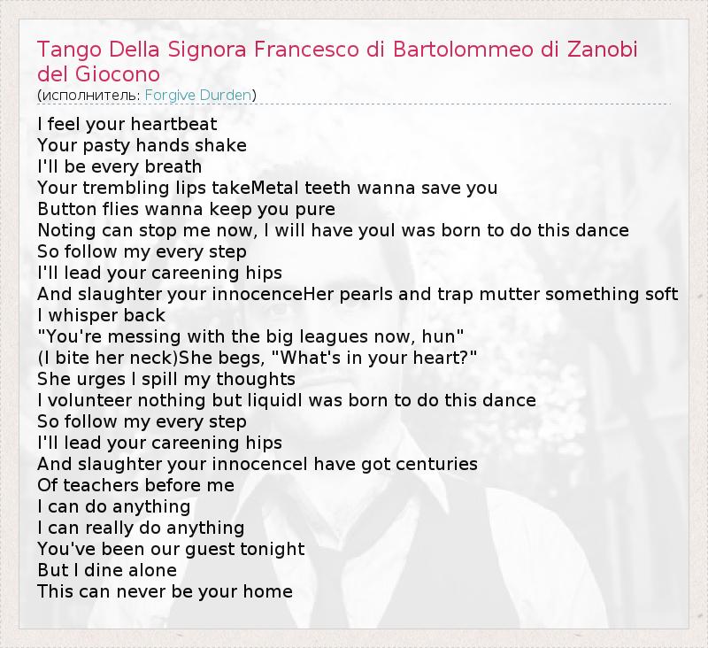 ГлавнаяИсполнителиForgive DurdenTango Della Signora Francesco di Bartolommeo di Zanobi del Giocono