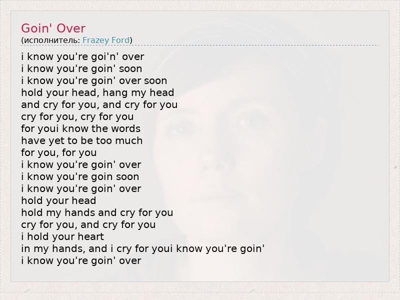 i know you're goi'n' over i know you're goin' soon i know you're goin' over soon hold your head, hang my head and cry for you, and cry for you cry for you, cry for you for youi know the words have yet to be too much for you, for you i know you're goin' over i know you're goin soon i know you're goin' over hold your head hold my hands and cry for you cry for you, and cry for you i hold your heart in my hands, and i cry for youi know you're goin' i know you're goin' over