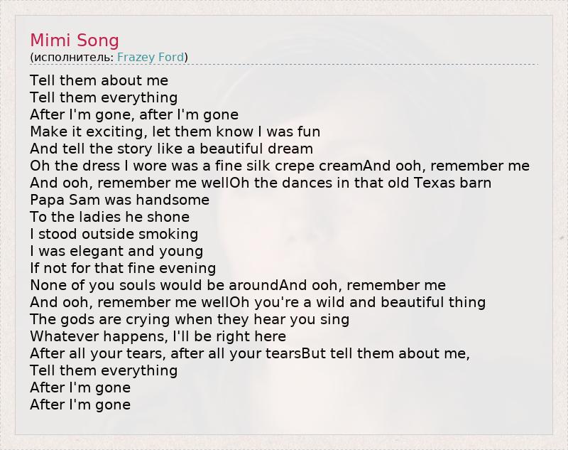 Tell them about me Tell them everything After I'm gone, after I'm gone Make it exciting, let them know I was fun And tell the story like a beautiful dream Oh the dress I wore was a fine silk crepe creamAnd ooh, remember me And ooh, remember me wellOh the dances in that old Texas barn Papa Sam was handsome To the ladies he shone I stood outside smoking I was elegant and young If not for that fine evening None of you souls would be aroundAnd ooh, remember me And ooh, remember me wellOh you're a wild and beautiful thing The gods are crying when they hear you sing Whatever happens, I'll be right here After all your tears, after all your tearsBut tell them about me, Tell them everything After I'm gone After I'm gone