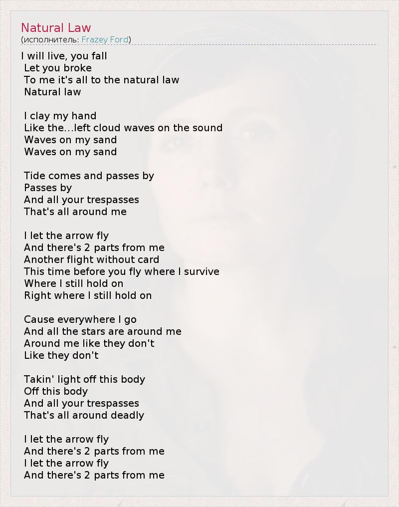 I will live, you fall Let you broke To me it's all to the natural law Natural law I clay my hand Like the…left cloud waves on the sound Waves on my sand Waves on my sand Tide comes and passes by Passes by And all your trespasses That's all around me I let the arrow fly And there's 2 parts from me Another flight without card This time before you fly where I survive Where I still hold on Right where I still hold on Cause everywhere I go And all the stars are around me Around me like they don't Like they don't Takin' light off this body Off this body And all your trespasses That's all around deadly I let the arrow fly And there's 2 parts from me I let the arrow fly And there's 2 parts from me