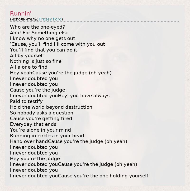 Who are the one-eyed? Aha! For Something else I know why no one gets out 'Cause, you'll find I'll come with you out You'll find that you can do it All by yourself Nothing is just so fine All alone to find Hey yeahCause you're the judge (oh yeah) I never doubted you I never doubted you Cause you're the judge I never doubted youHey, you have always Paid to testify Hold the world beyond destruction So nobody asks a question Cause you're getting tired Everyday that ends You're alone in your mind Running in circles in your heart Hand over handCause you're the judge (oh yeah) I never doubted you I never doubted you Hey you're the judge I never doubted youCause you're the judge (oh yeah) I never doubted you I never doubted youCause you're the one holding yourself