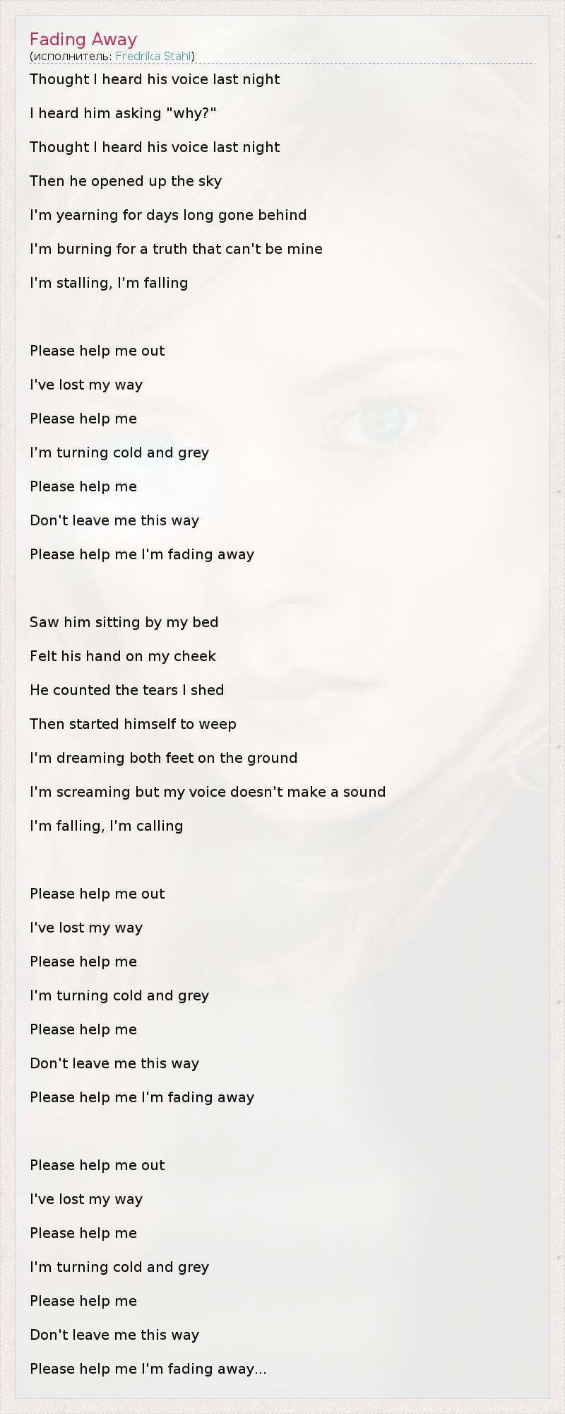 Thought I heard his voice last night I heard him asking "why?" Thought I heard his voice last night Then he opened up the sky I'm yearning for days long gone behind I'm burning for a truth that can't be mine I'm stalling, I'm falling Please help me out I've lost my way Please help me I'm turning cold and grey Please help me Don't leave me this way Please help me I'm fading away Saw him sitting by my bed Felt his hand on my cheek He counted the tears I shed Then started himself to weep I'm dreaming both feet on the ground I'm screaming but my voice doesn't make a sound I'm falling, I'm calling Please help me out I've lost my way Please help me I'm turning cold and grey Please help me Don't leave me this way Please help me I'm fading away Please help me out I've lost my way Please help me I'm turning cold and grey Please help me Don't leave me this way Please help me I'm fading away...