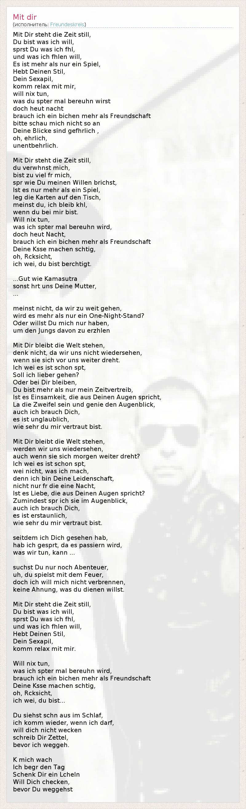 Mit Dir steht die Zeit still, Du bist was ich will, sprst Du was ich fhl, und was ich fhlen will, Es ist mehr als nur ein Spiel, Hebt Deinen Stil, Dein Sexapil, komm relax mit mir, will nix tun, was du spter mal bereuhn wirst doch heut nacht brauch ich ein bichen mehr als Freundschaft bitte schau mich nicht so an Deine Blicke sind gefhrlich , oh, ehrlich, unentbehrlich. Mit Dir steht die Zeit still, du verwhnst mich, bist zu viel fr mich, spr wie Du meinen Willen brichst, Ist es nur mehr als ein Spiel, leg die Karten auf den Tisch, meinst du, ich bleib khl, wenn du bei mir bist. Will nix tun, was ich spter mal bereuhn wird, doch heut Nacht, brauch ich ein bichen mehr als Freundschaft Deine Ksse machen schtig, oh, Rcksicht, ich wei, du bist berchtigt. ...Gut wie Kamasutra sonst hrt uns Deine Mutter, ... meinst nicht, da wir zu weit gehen, wird es mehr als nur ein One-Night-Stand? Oder willst Du mich nur haben, um den Jungs davon zu erzhlen Mit Dir bleibt die Welt stehen, denk nicht, da wir uns nicht wiedersehen, wenn sie sich vor uns weiter dreht. Ich wei es ist schon spt, Soll ich lieber gehen? Oder bei Dir bleiben, Du bist mehr als nur mein Zeitvertreib, Ist es Einsamkeit, die aus Deinen Augen spricht, La die Zweifel sein und genie den Augenblick, auch ich brauch Dich, es ist unglaublich, wie sehr du mir vertraut bist. Mit Dir bleibt die Welt stehen, werden wir uns wiedersehen, auch wenn sie sich morgen weiter dreht? Ich wei es ist schon spt, wei nicht, was ich mach, denn ich bin Deine Leidenschaft, nicht nur fr die eine Nacht, Ist es Liebe, die aus Deinen Augen spricht? Zumindest spr ich sie im Augenblick, auch ich brauch Dich, es ist erstaunlich, wie sehr du mir vertraut bist. seitdem ich Dich gesehen hab, hab ich gesprt, da es passiern wird, was wir tun, kann ... suchst Du nur noch Abenteuer, uh, du spielst mit dem Feuer, doch ich will mich nicht verbrennen, keine Ahnung, was du dienen willst. Mit Dir steht die Zeit still, Du bist was ich will, sprst Du was ich fhl, und was ich fhlen will, Hebt Deinen Stil, Dein Sexapil, komm relax mit mir. Will nix tun, was ich spter mal bereuhn wird, brauch ich ein bichen mehr als Freundschaft Deine Ksse machen schtig, oh, Rcksicht, ich wei, du bist... Du siehst schn aus im Schlaf, ich komm wieder, wenn ich darf, will dich nicht wecken schreib Dir Zettel, bevor ich weggeh. K mich wach Ich begr den Tag Schenk Dir ein Lcheln Will Dich checken, bevor Du weggehst