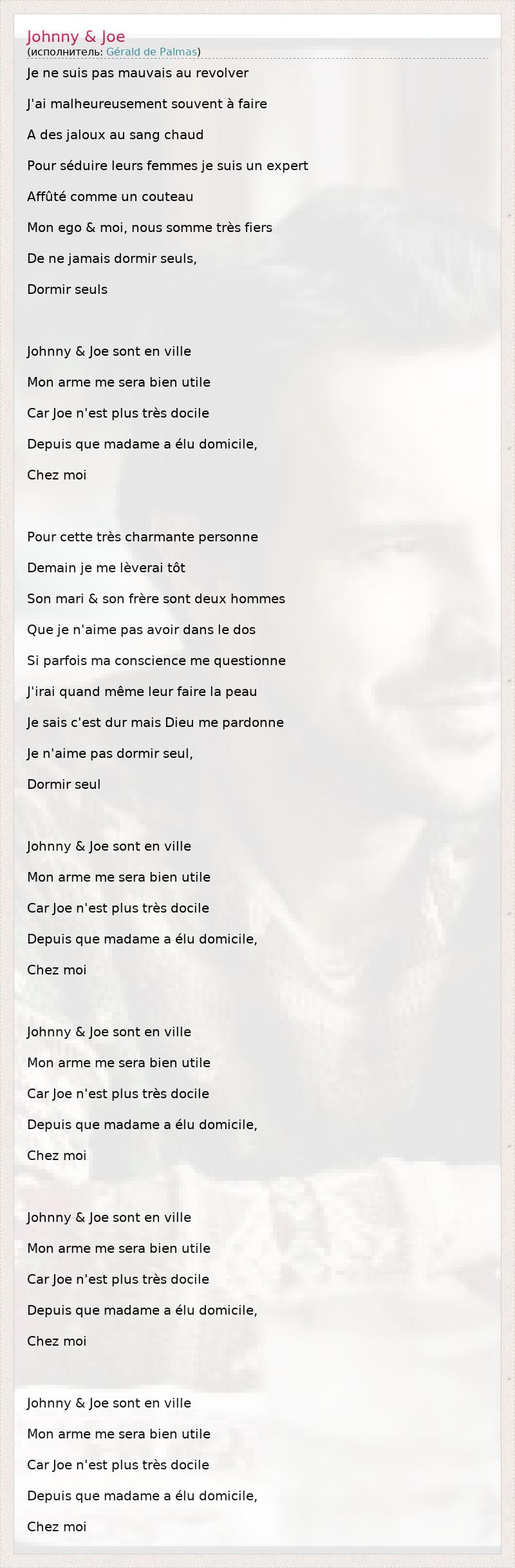 Je ne suis pas mauvais au revolver J'ai malheureusement souvent à faire A des jaloux au sang chaud Pour séduire leurs femmes je suis un expert Affûté comme un couteau Mon ego & moi, nous somme très fiers De ne jamais dormir seuls, Dormir seuls Johnny & Joe sont en ville Mon arme me sera bien utile Car Joe n'est plus très docile Depuis que madame a élu domicile, Chez moi Pour cette très charmante personne Demain je me lèverai tôt Son mari & son frère sont deux hommes Que je n'aime pas avoir dans le dos Si parfois ma conscience me questionne J'irai quand même leur faire la peau Je sais c'est dur mais Dieu me pardonne Je n'aime pas dormir seul, Dormir seul Johnny & Joe sont en ville Mon arme me sera bien utile Car Joe n'est plus très docile Depuis que madame a élu domicile, Chez moi Johnny & Joe sont en ville Mon arme me sera bien utile Car Joe n'est plus très docile Depuis que madame a élu domicile, Chez moi Johnny & Joe sont en ville Mon arme me sera bien utile Car Joe n'est plus très docile Depuis que madame a élu domicile, Chez moi Johnny & Joe sont en ville Mon arme me sera bien utile Car Joe n'est plus très docile Depuis que madame a élu domicile, Chez moi