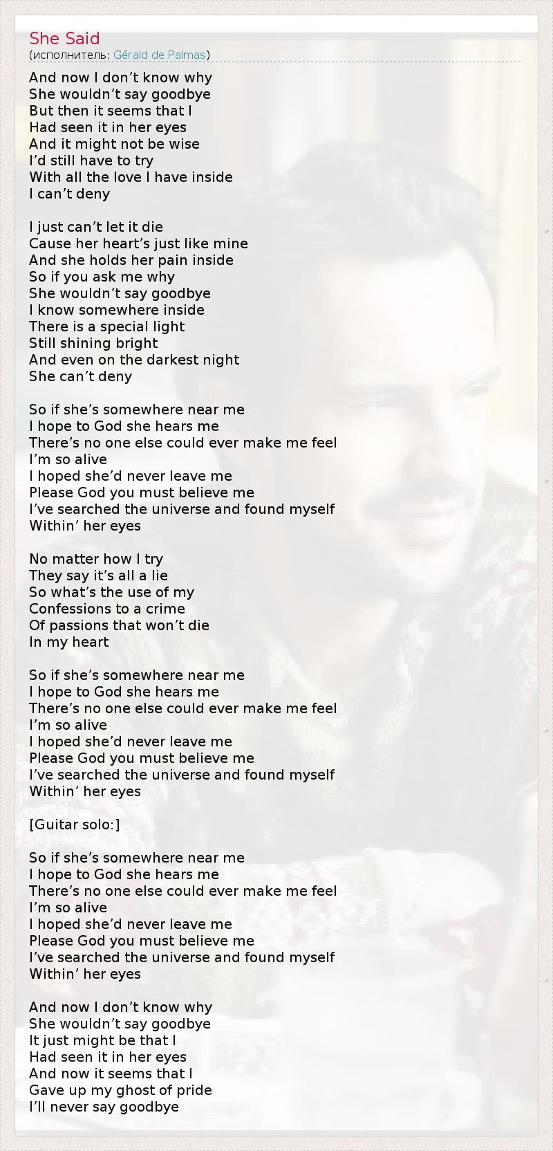 Теперь я не знаю, почему Она не сказала "Прощай!". Но мне кажется, Что я заметил это в ее глазах. И, возможно, это глупо, Но я все же еще должен попробовать, Со всей той любовью, что есть во мне, Я не могу от этого отказаться.... Я просто не могу позволить чувству умереть, Потому что ее сердце похоже на моё, И она не показывает свою боль. Поэтому, если вы спросите меня, почему Она не сказала "Прощай!" - Я знаю в глубине души, Что в ней есть особый свет, Сияющий ярко, как прежде, Даже в самую темную ночь, И она не может этого отрицать.... Если она где-то рядом со мной, Я надеюсь на Бога, что она меня слышит. Не существует больше никого, кто пробуждал бы во мне такие чувства, Я чувствую себя таким живым, Я надеялся, чтоона никогда не оставит меня... Пожалуйста, Боже, поверь мне! Я обыскал всю вселенную и нашел себя В ее глазах… Как бы я ни старалась, Говорят, что все это ложь. Тогда какой же мне смысл Раскаиваться в ошибках, совершенных Из-за страсти, которая не умрет В моем сердце... Если она где-то рядом со мной, Я надеюсь на Бога, что она меня слышит. Не существует больше никого, кто пробуждал бы во мне такие чувства, Я чувствую себя таким живым, Я надеялся, чтоона никогда не оставит меня... Пожалуйста, Боже, поверь мне! Я обыскал всю вселенную и нашел себя В ее глазах… [Cоло на гитаре:] Если она где-то рядом со мной, Я надеюсь на Бога, что она меня слышит. Не существует больше никого, кто пробуждал бы во мне такие чувства, Я чувствую себя таким живым, Я надеялся, чтоона никогда не оставит меня... Пожалуйста, Боже, поверь мне! Я обыскал всю вселенную и нашел себя В ее глазах… И теперь я не знаю, почему Она не скажет "Прощай!" Должно быть, Я видел это в ее глазах. И теперь, мне кажется, что я Прогнал свой призрак гордости, И уже никогда не скажу "Прощай!"
