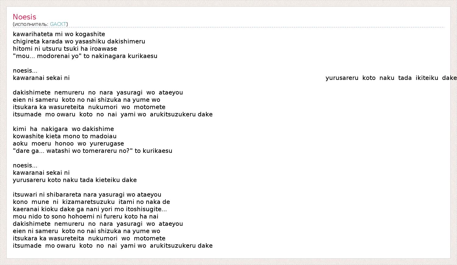 kawarihateta mi wo kogashite chigireta karada wo yasashiku dakishimeru hitomi ni utsuru tsuki ha iroawase "mou... modorenai yo" to nakinagara kurikaesu noesis... kawaranai sekai ni yurusareru koto naku tada ikiteiku dake dakishimete nemureru no nara yasuragi wo ataeyou eien ni sameru koto no nai shizuka na yume wo itsukara ka wasureteita nukumori wo motomete itsumade mo owaru koto no nai yami wo arukitsuzukeru dake kimi ha nakigara wo dakishime kowashite kieta mono to madoiau aoku moeru honoo wo yurerugase "dare ga... watashi wo tomerareru no?" to kurikaesu noesis... kawaranai sekai ni yurusareru koto naku tada kieteiku dake itsuwari ni shibarareta nara yasuragi wo ataeyou kono mune ni kizamaretsuzuku itami no naka de kaeranai kioku dake ga nani yori mo itoshisugite... mou nido to sono hohoemi ni fureru koto ha nai dakishimete nemureru no nara yasuragi wo ataeyou eien ni sameru koto no nai shizuka na yume wo itsukara ka wasureteita nukumori wo motomete itsumade mo owaru koto no nai yami wo arukitsuzukeru dake