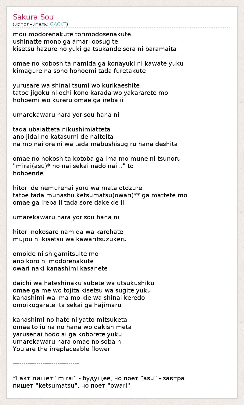 *Гакт пишет "mirai" - будущее, но поет "аsu" - завтра