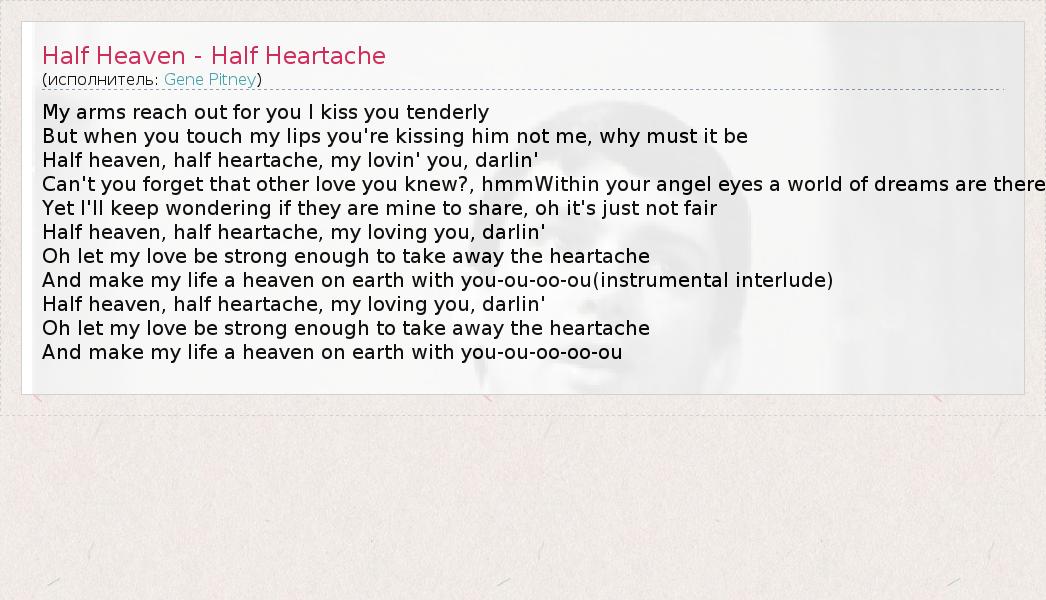 My arms reach out for you I kiss you tenderly But when you touch my lips you're kissing him not me, why must it be Half heaven, half heartache, my lovin' you, darlin' Can't you forget that other love you knew?, hmmWithin your angel eyes a world of dreams are there Yet I'll keep wondering if they are mine to share, oh it's just not fair Half heaven, half heartache, my loving you, darlin' Oh let my love be strong enough to take away the heartache And make my life a heaven on earth with you-ou-oo-ou(instrumental interlude) Half heaven, half heartache, my loving you, darlin' Oh let my love be strong enough to take away the heartache And make my life a heaven on earth with you-ou-oo-oo-ou
