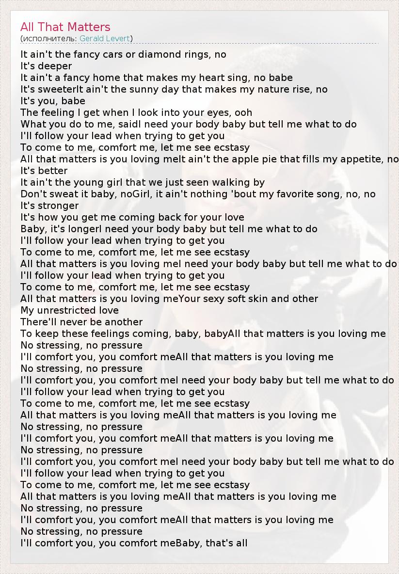 It ain't the fancy cars or diamond rings, no It's deeper It ain't a fancy home that makes my heart sing, no babe It's sweeterIt ain't the sunny day that makes my nature rise, no It's you, babe The feeling I get when I look into your eyes, ooh What you do to me, saidI need your body baby but tell me what to do I'll follow your lead when trying to get you To come to me, comfort me, let me see ecstasy All that matters is you loving meIt ain't the apple pie that fills my appetite, no It's better It ain't the young girl that we just seen walking by Don't sweat it baby, noGirl, it ain't nothing 'bout my favorite song, no, no It's stronger It's how you get me coming back for your love Baby, it's longerI need your body baby but tell me what to do I'll follow your lead when trying to get you To come to me, comfort me, let me see ecstasy All that matters is you loving meI need your body baby but tell me what to do I'll follow your lead when trying to get you To come to me, comfort me, let me see ecstasy All that matters is you loving meYour sexy soft skin and other My unrestricted love There'll never be another To keep these feelings coming, baby, babyAll that matters is you loving me No stressing, no pressure I'll comfort you, you comfort meAll that matters is you loving me No stressing, no pressure I'll comfort you, you comfort meI need your body baby but tell me what to do I'll follow your lead when trying to get you To come to me, comfort me, let me see ecstasy All that matters is you loving meAll that matters is you loving me No stressing, no pressure I'll comfort you, you comfort meAll that matters is you loving me No stressing, no pressure I'll comfort you, you comfort meI need your body baby but tell me what to do I'll follow your lead when trying to get you To come to me, comfort me, let me see ecstasy All that matters is you loving meAll that matters is you loving me No stressing, no pressure I'll comfort you, you comfort meAll that matters is you loving me No stressing, no pressure I'll comfort you, you comfort meBaby, that's all