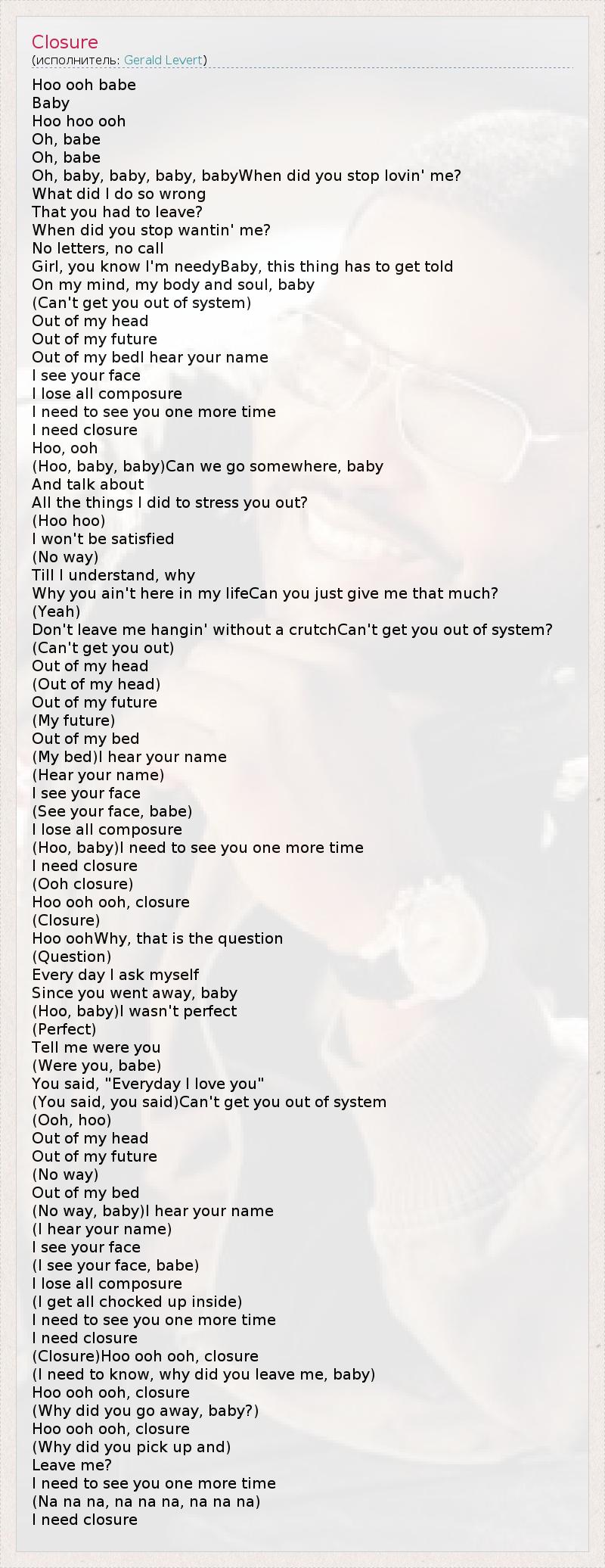 Hoo ooh babe Baby Hoo hoo ooh Oh, babe Oh, babe Oh, baby, baby, baby, babyWhen did you stop lovin' me? What did I do so wrong That you had to leave? When did you stop wantin' me? No letters, no call Girl, you know I'm needyBaby, this thing has to get told On my mind, my body and soul, baby (Can't get you out of system) Out of my head Out of my future Out of my bedI hear your name I see your face I lose all composure I need to see you one more time I need closure Hoo, ooh (Hoo, baby, baby)Can we go somewhere, baby And talk about All the things I did to stress you out? (Hoo hoo) I won't be satisfied (No way) Till I understand, why Why you ain't here in my lifeCan you just give me that much? (Yeah) Don't leave me hangin' without a crutchCan't get you out of system? (Can't get you out) Out of my head (Out of my head) Out of my future (My future) Out of my bed (My bed)I hear your name (Hear your name) I see your face (See your face, babe) I lose all composure (Hoo, baby)I need to see you one more time I need closure (Ooh closure) Hoo ooh ooh, closure (Closure) Hoo oohWhy, that is the question (Question) Every day I ask myself Since you went away, baby (Hoo, baby)I wasn't perfect (Perfect) Tell me were you (Were you, babe) You said, "Everyday I love you" (You said, you said)Can't get you out of system (Ooh, hoo) Out of my head Out of my future (No way) Out of my bed (No way, baby)I hear your name (I hear your name) I see your face (I see your face, babe) I lose all composure (I get all chocked up inside) I need to see you one more time I need closure (Closure)Hoo ooh ooh, closure (I need to know, why did you leave me, baby) Hoo ooh ooh, closure (Why did you go away, baby?) Hoo ooh ooh, closure (Why did you pick up and) Leave me? I need to see you one more time (Na na na, na na na, na na na) I need closure