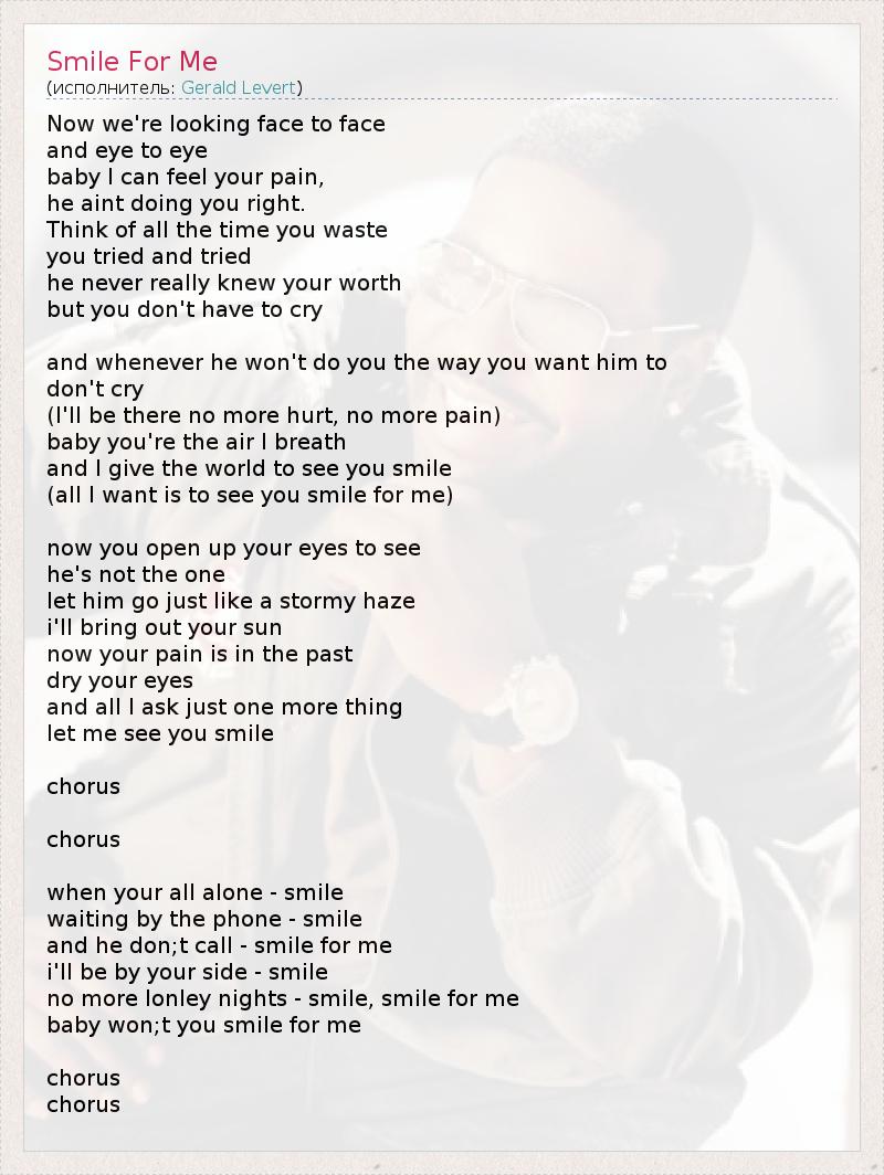 Now we're looking face to face and eye to eye baby I can feel your pain, he aint doing you right. Think of all the time you waste you tried and tried he never really knew your worth but you don't have to cry and whenever he won't do you the way you want him to don't cry (I'll be there no more hurt, no more pain) baby you're the air I breath and I give the world to see you smile (all I want is to see you smile for me) now you open up your eyes to see he's not the one let him go just like a stormy haze i'll bring out your sun now your pain is in the past dry your eyes and all I ask just one more thing let me see you smile chorus chorus when your all alone - smile waiting by the phone - smile and he don;t call - smile for me i'll be by your side - smile no more lonley nights - smile, smile for me baby won;t you smile for me chorus chorus