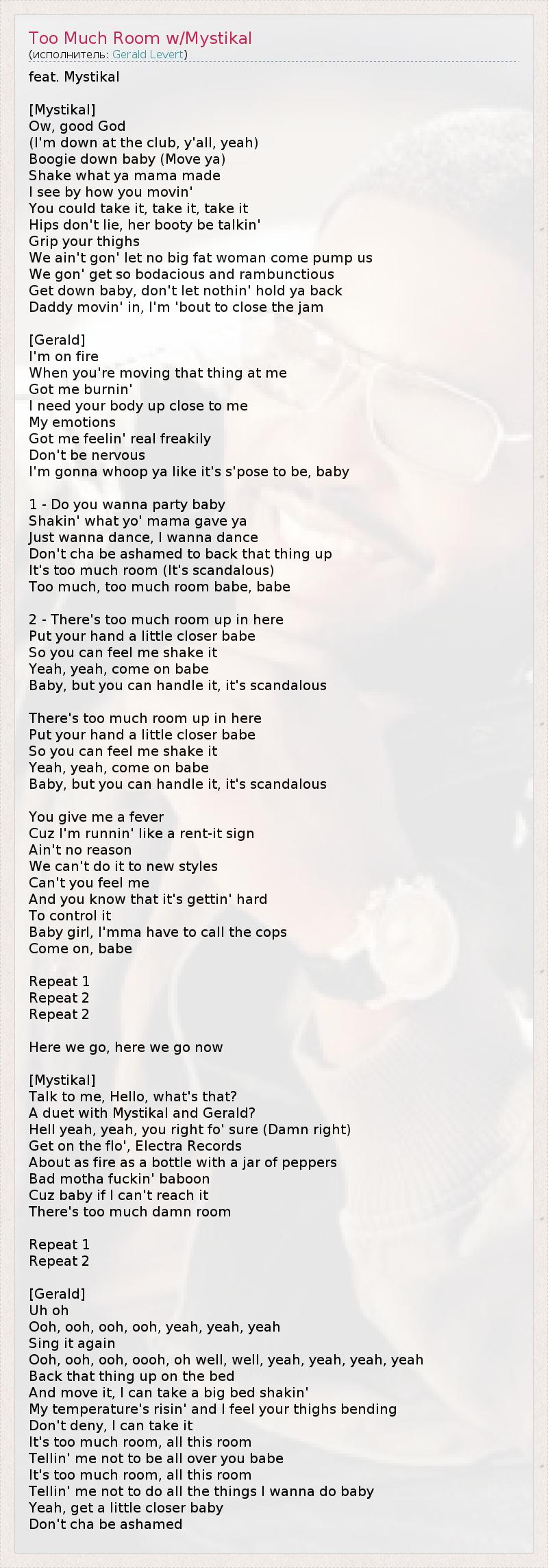 feat. Mystikal [Mystikal] Ow, good God (I'm down at the club, y'all, yeah) Boogie down baby (Move ya) Shake what ya mama made I see by how you movin' You could take it, take it, take it Hips don't lie, her booty be talkin' Grip your thighs We ain't gon' let no big fat woman come pump us We gon' get so bodacious and rambunctious Get down baby, don't let nothin' hold ya back Daddy movin' in, I'm 'bout to close the jam [Gerald] I'm on fire When you're moving that thing at me Got me burnin' I need your body up close to me My emotions Got me feelin' real freakily Don't be nervous I'm gonna whoop ya like it's s'pose to be, baby 1 - Do you wanna party baby Shakin' what yo' mama gave ya Just wanna dance, I wanna dance Don't cha be ashamed to back that thing up It's too much room (It's scandalous) Too much, too much room babe, babe 2 - There's too much room up in here Put your hand a little closer babe So you can feel me shake it Yeah, yeah, come on babe Baby, but you can handle it, it's scandalous There's too much room up in here Put your hand a little closer babe So you can feel me shake it Yeah, yeah, come on babe Baby, but you can handle it, it's scandalous You give me a fever Cuz I'm runnin' like a rent-it sign Ain't no reason We can't do it to new styles Can't you feel me And you know that it's gettin' hard To control it Baby girl, I'mma have to call the cops Come on, babe Repeat 1 Repeat 2 Repeat 2 Here we go, here we go now [Mystikal] Talk to me, Hello, what's that? A duet with Mystikal and Gerald? Hell yeah, yeah, you right fo' sure (Damn right) Get on the flo', Electra Records About as fire as a bottle with a jar of peppers Bad motha fuckin' baboon Cuz baby if I can't reach it There's too much damn room Repeat 1 Repeat 2 [Gerald] Uh oh Ooh, ooh, ooh, ooh, yeah, yeah, yeah Sing it again Ooh, ooh, ooh, oooh, oh well, well, yeah, yeah, yeah, yeah Back that thing up on the bed And move it, I can take a big bed shakin' My temperature's risin' and I feel your thighs bending Don't deny, I can take it It's too much room, all this room Tellin' me not to be all over you babe It's too much room, all this room Tellin' me not to do all the things I wanna do baby Yeah, get a little closer baby Don't cha be ashamed