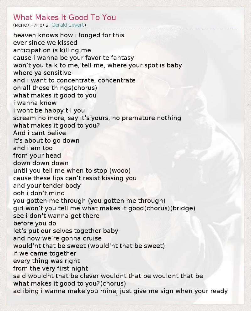 heaven knows how i longed for this ever since we kissed anticipation is killing me cause i wanna be your favorite fantasy won't you talk to me, tell me, where your spot is baby where ya sensitive and i want to concentrate, concentrate on all those things(chorus) what makes it good to you i wanna know i wont be happy til you scream no more, say it's yours, no premature nothing what makes it good to you? And i cant belive it's about to go down and i am too from your head down down down until you tell me when to stop (wooo) cause these lips can't resist kissing you and your tender body ooh i don't mind you gotten me through (you gotten me through) girl won't you tell me what makes it good(chorus)(bridge) see i don't wanna get there before you do let's put our selves together baby and now we're gonna cruise would'nt that be sweet (would'nt that be sweet) if we came together every thing was right from the very first night said wouldnt that be clever wouldnt that be wouldnt that be what makes it good to you?(chorus) adlibing i wanna make you mine, just give me sign when your ready
