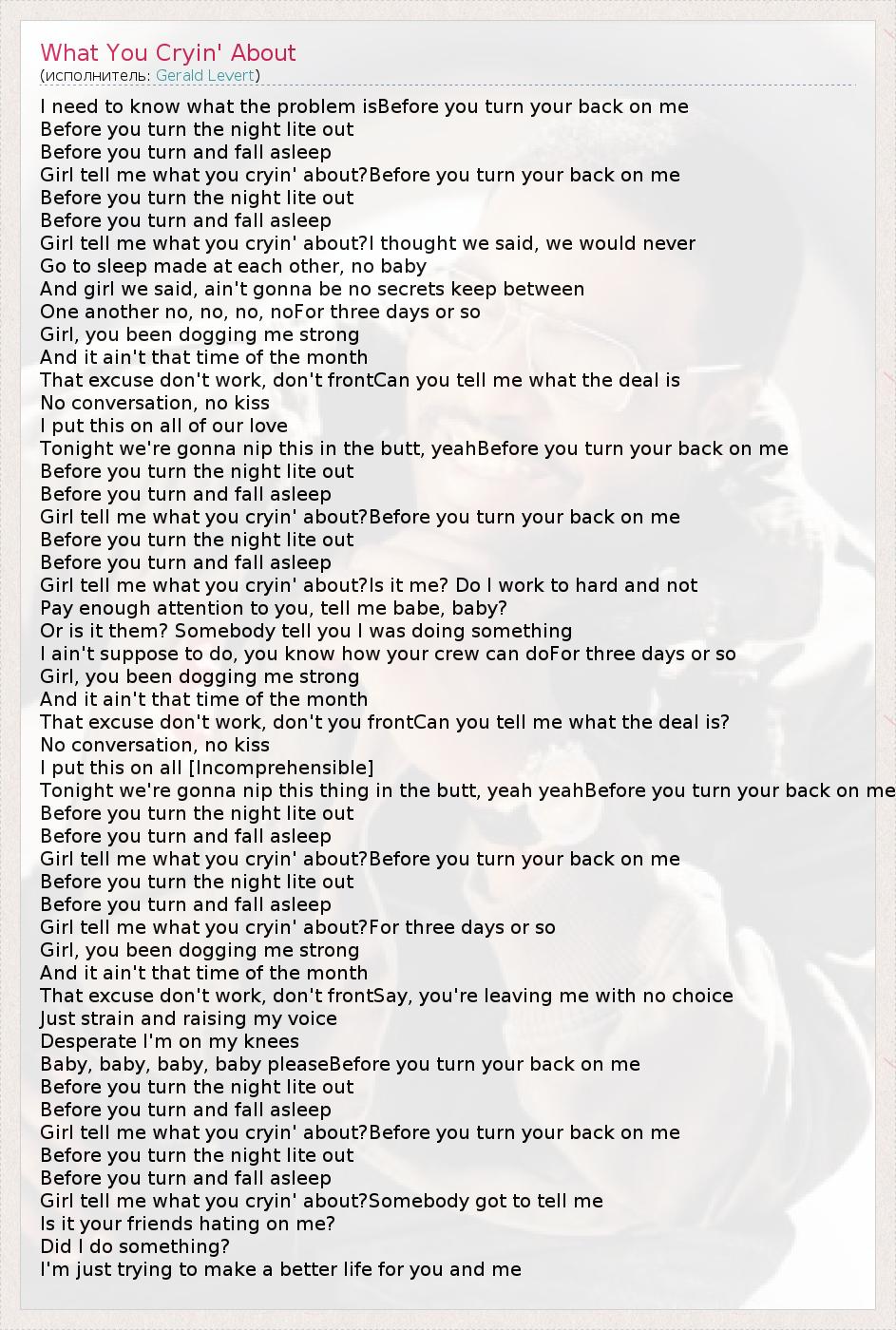 I need to know what the problem isBefore you turn your back on me Before you turn the night lite out Before you turn and fall asleep Girl tell me what you cryin' about?Before you turn your back on me Before you turn the night lite out Before you turn and fall asleep Girl tell me what you cryin' about?I thought we said, we would never Go to sleep made at each other, no baby And girl we said, ain't gonna be no secrets keep between One another no, no, no, noFor three days or so Girl, you been dogging me strong And it ain't that time of the month That excuse don't work, don't frontCan you tell me what the deal is No conversation, no kiss I put this on all of our love Tonight we're gonna nip this in the butt, yeahBefore you turn your back on me Before you turn the night lite out Before you turn and fall asleep Girl tell me what you cryin' about?Before you turn your back on me Before you turn the night lite out Before you turn and fall asleep Girl tell me what you cryin' about?Is it me? Do I work to hard and not Pay enough attention to you, tell me babe, baby? Or is it them? Somebody tell you I was doing something I ain't suppose to do, you know how your crew can doFor three days or so Girl, you been dogging me strong And it ain't that time of the month That excuse don't work, don't you frontCan you tell me what the deal is? No conversation, no kiss I put this on all [Incomprehensible] Tonight we're gonna nip this thing in the butt, yeah yeahBefore you turn your back on me Before you turn the night lite out Before you turn and fall asleep Girl tell me what you cryin' about?Before you turn your back on me Before you turn the night lite out Before you turn and fall asleep Girl tell me what you cryin' about?For three days or so Girl, you been dogging me strong And it ain't that time of the month That excuse don't work, don't frontSay, you're leaving me with no choice Just strain and raising my voice Desperate I'm on my knees Baby, baby, baby, baby pleaseBefore you turn your back on me Before you turn the night lite out Before you turn and fall asleep Girl tell me what you cryin' about?Before you turn your back on me Before you turn the night lite out Before you turn and fall asleep Girl tell me what you cryin' about?Somebody got to tell me Is it your friends hating on me? Did I do something? I'm just trying to make a better life for you and me