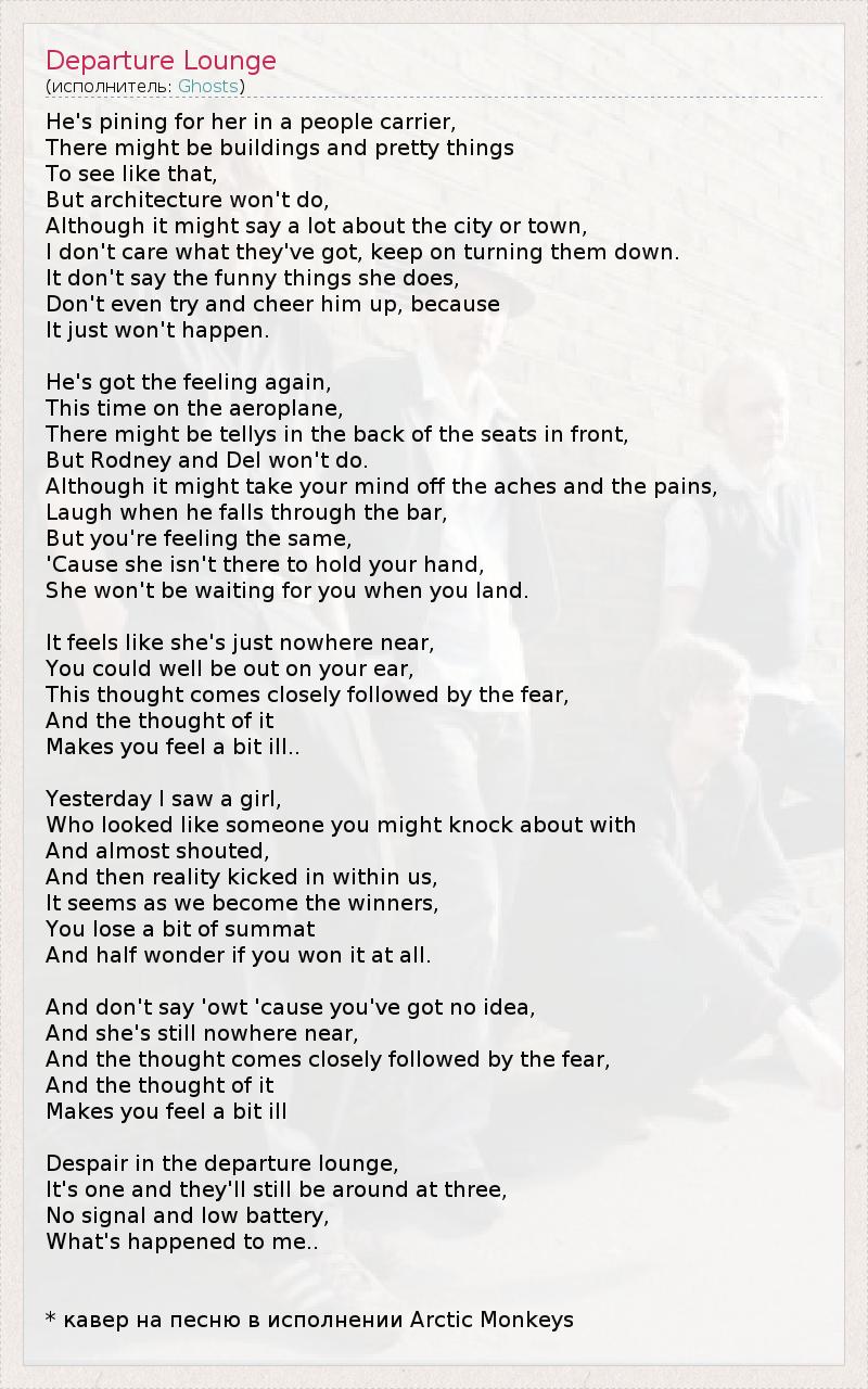 He's pining for her in a people carrier, There might be buildings and pretty things To see like that, But architecture won't do, Although it might say a lot about the city or town, I don't care what they've got, keep on turning them down. It don't say the funny things she does, Don't even try and cheer him up, because It just won't happen. He's got the feeling again, This time on the aeroplane, There might be tellys in the back of the seats in front, But Rodney and Del won't do. Although it might take your mind off the aches and the pains, Laugh when he falls through the bar, But you're feeling the same, 'Cause she isn't there to hold your hand, She won't be waiting for you when you land. It feels like she's just nowhere near, You could well be out on your ear, This thought comes closely followed by the fear, And the thought of it Makes you feel a bit ill.. Yesterday I saw a girl, Who looked like someone you might knock about with And almost shouted, And then reality kicked in within us, It seems as we become the winners, You lose a bit of summat And half wonder if you won it at all. And don't say 'owt 'cause you've got no idea, And she's still nowhere near, And the thought comes closely followed by the fear, And the thought of it Makes you feel a bit ill Despair in the departure lounge, It's one and they'll still be around at three, No signal and low battery, What's happened to me.. * кавер на песню в исполнении Arctic Monkeys