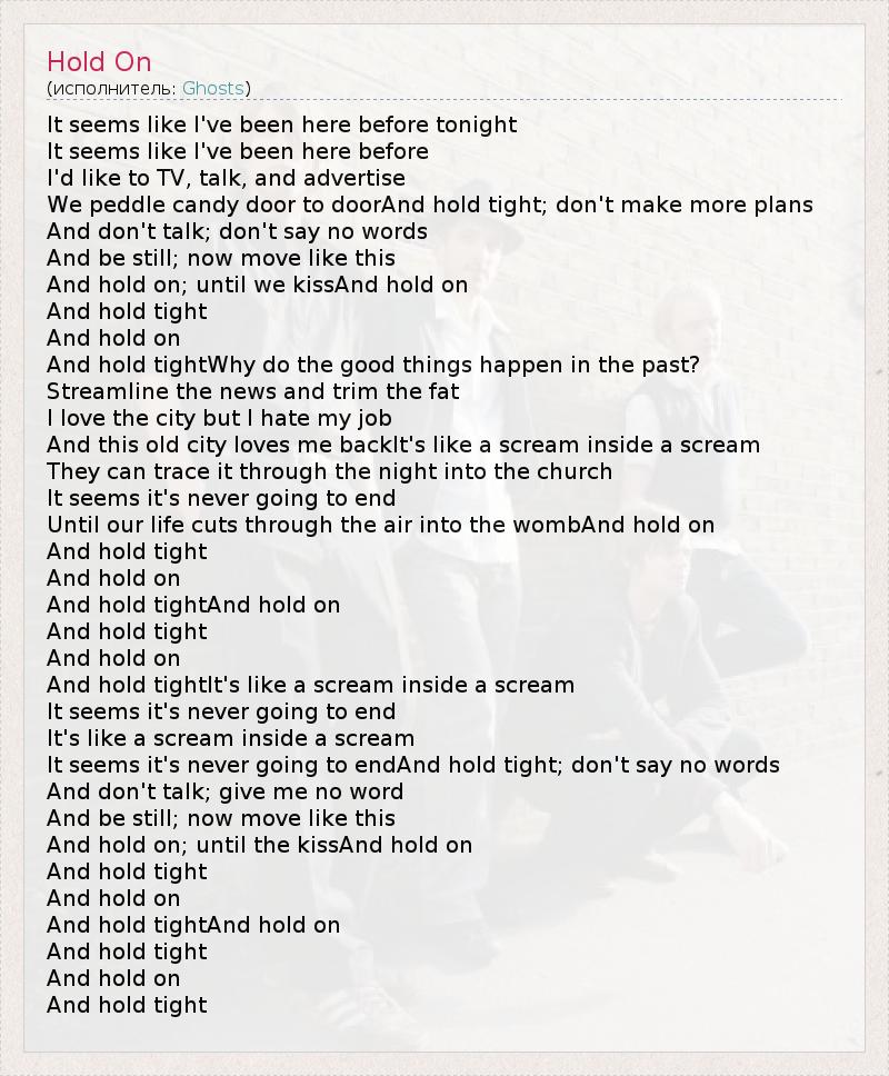 It seems like I've been here before tonight It seems like I've been here before I'd like to TV, talk, and advertise We peddle candy door to doorAnd hold tight; don't make more plans And don't talk; don't say no words And be still; now move like this And hold on; until we kissAnd hold on And hold tight And hold on And hold tightWhy do the good things happen in the past? Streamline the news and trim the fat I love the city but I hate my job And this old city loves me backIt's like a scream inside a scream They can trace it through the night into the church It seems it's never going to end Until our life cuts through the air into the wombAnd hold on And hold tight And hold on And hold tightAnd hold on And hold tight And hold on And hold tightIt's like a scream inside a scream It seems it's never going to end It's like a scream inside a scream It seems it's never going to endAnd hold tight; don't say no words And don't talk; give me no word And be still; now move like this And hold on; until the kissAnd hold on And hold tight And hold on And hold tightAnd hold on And hold tight And hold on And hold tight