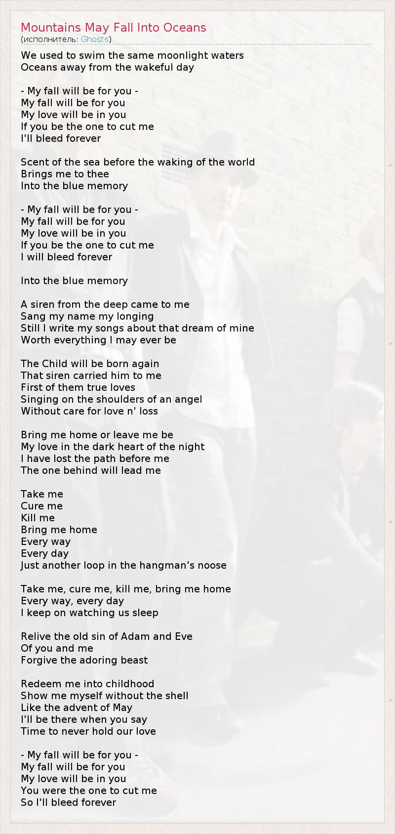 Раньше мы плавали в этих полуночных водах, На расстоянии океанов от бессонного дня... - Мое падение будет ради тебя - Мое падение будет ради тебя Моя любовь будет в тебе Если ты станешь той, что ранит меня, Я буду истекать кровью вечно... Запах моря ещё прежде, чем начинается день, Приносит меня к тебе В эти грустные воспоминания... - Мое падение будет ради тебя - Мое падение будет ради тебя Моя любовь будет в тебе Если ты будешь той, что ранит меня, Я буду кровоточить вечно... В эти грустные воспоминания... Сирена из глубин пришла ко мне, Пропела мое имя и мое желание, Пока я пишу песни о своих мечтах, Что стоят больше, чем то, кем я стану... Дитя родится вновь, И Сирена принесет его ко мне, Первую мою истинную любовь, Поющего на плечах ангела Без переживаний о любви и потерях... Приведи меня домой или дай мне просто быть, Моя любовь в темном сердце ночи. Я потеряла дорогу, по которой мне идти, Тот, кто позади, поведёт меня за собой... Возьми меня, Исцели меня, Убей меня, Приведи домой Любыми путями, В любой день, Просто еще один виток в петле палача... Возьми меня, излечи меня, убей меня, приведи домой Любыми путями, в любой день, Я смотрю за нами во сне... Переживи старый грех Адама и Евы, Тебя и меня, Прости обожающее чудовище. Верни меня в детство, Покажи мне меня без оболочки. Словно приход мая, Я буду там, когда ты скажешь. Пора отпустить нашу любовь... - Мое падение будет ради тебя - Мое падение будет ради тебя Моя любовь будет в тебе Ты стала той, кто ранил меня, И я буду истекать кровью вечно...