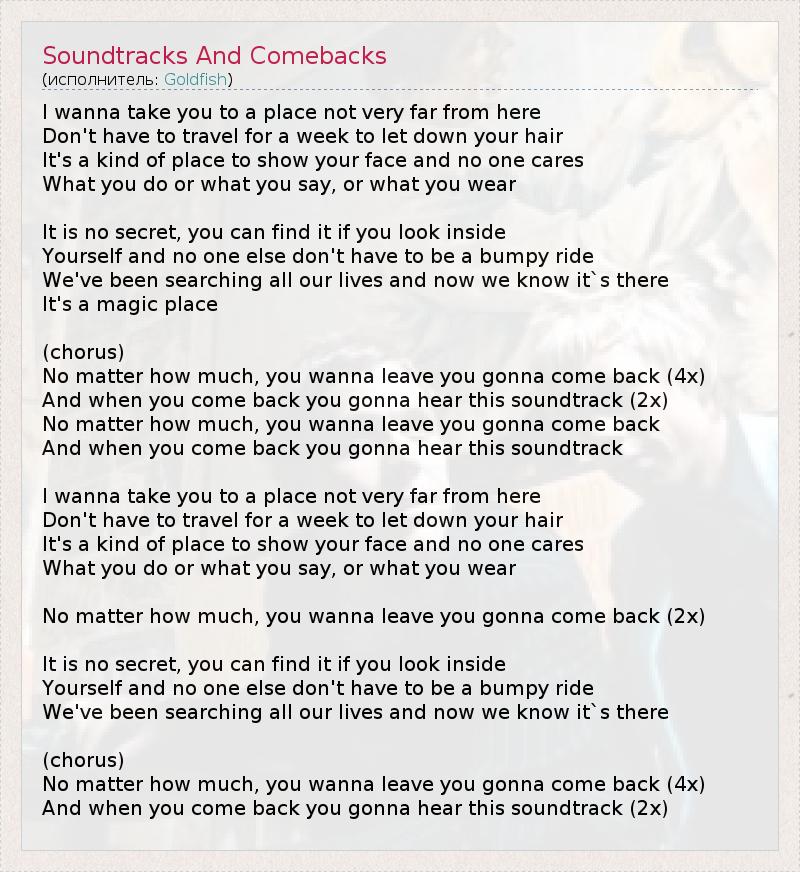 Я хочу взять вас к месту не очень далеко отсюда Не нужно ехать на неделю подвести ваши волосы Это вид места, чтобы показать свое лицо , и никто не заботится То, что вы делаете и что вы говорите, и то, что вы носите Ни для кого не секрет, вы можете найти его, если вы посмотрите внутрь Сам и никто другой не должны быть тернистый путь Мы искали всю нашу жизнь , и теперь мы знаем, что ` есть Это волшебное место (Хор) Независимо от того, сколько, ты хочешь оставить вас буду не вернуться ( 4x) И когда вы возвращаетесь, вы услышите эту саундтрек (2x) Независимо от того, сколько, ты хочешь не оставляют ты собираешься вернуться И когда вы возвращаетесь, вы услышите эту саундтрек Я хочу взять вас к месту не очень далеко отсюда Не нужно ехать на неделю подвести ваши волосы Это вид места, чтобы показать свое лицо , и никто не заботится То, что вы делаете и что вы говорите, и то, что вы носите Независимо от того, сколько, ты хочешь оставить вас буду не вернуться ( 2x) Ни для кого не секрет, вы можете найти его, если вы посмотрите внутрь Сам и никто другой не должны быть тернистый путь Мы искали всю нашу жизнь , и теперь мы знаем, что ` есть (Хор) Независимо от того, сколько, ты хочешь оставить вас буду не вернуться ( 4x) И когда вы возвращаетесь, вы услышите эту саундтрек (2x)