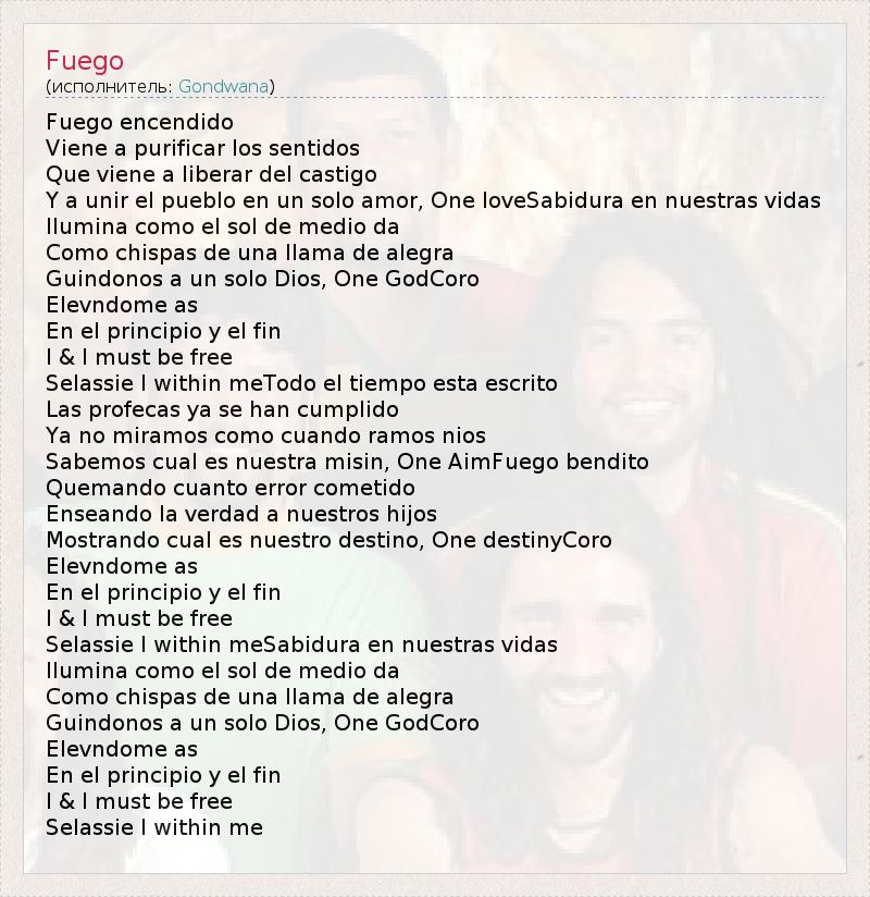 Fuego encendido Viene a purificar los sentidos Que viene a liberar del castigo Y a unir el pueblo en un solo amor, One loveSabidura en nuestras vidas Ilumina como el sol de medio da Como chispas de una llama de alegra Guindonos a un solo Dios, One GodCoro Elevndome as En el principio y el fin I & I must be free Selassie I within meTodo el tiempo esta escrito Las profecas ya se han cumplido Ya no miramos como cuando ramos nios Sabemos cual es nuestra misin, One AimFuego bendito Quemando cuanto error cometido Enseando la verdad a nuestros hijos Mostrando cual es nuestro destino, One destinyCoro Elevndome as En el principio y el fin I & I must be free Selassie I within meSabidura en nuestras vidas Ilumina como el sol de medio da Como chispas de una llama de alegra Guindonos a un solo Dios, One GodCoro Elevndome as En el principio y el fin I & I must be free Selassie I within me