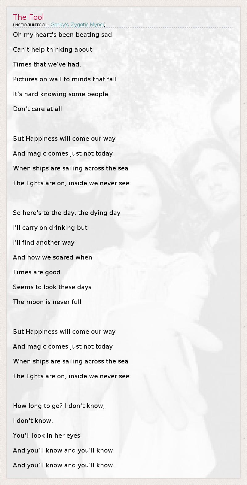 Oh my heart's been beating sad Can't help thinking about Times that we've had. Pictures on wall to minds that fall It's hard knowing some people Don't care at all But Happiness will come our way And magic comes just not today When ships are sailing across the sea The lights are on, inside we never see So here's to the day, the dying day I'll carry on drinking but I'll find another way And how we soared when Times are good Seems to look these days The moon is never full But Happiness will come our way And magic comes just not today When ships are sailing across the sea The lights are on, inside we never see How long to go? I don't know, I don't know. You'll look in her eyes And you'll know and you'll know And you'll know and you'll know.