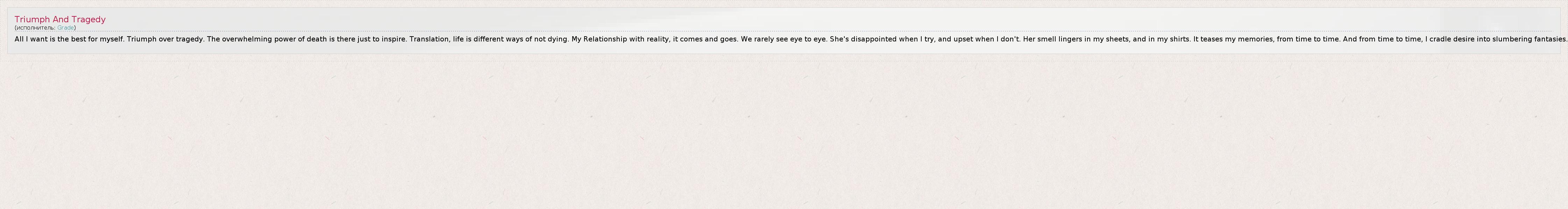 All I want is the best for myself. Triumph over tragedy. The overwhelming power of death is there just to inspire. Translation, life is different ways of not dying. My Relationship with reality, it comes and goes. We rarely see eye to eye. She's disappointed when I try, and upset when I don't. Her smell lingers in my sheets, and in my shirts. It teases my memories, from time to time. And from time to time, I cradle desire into slumbering fantasies.