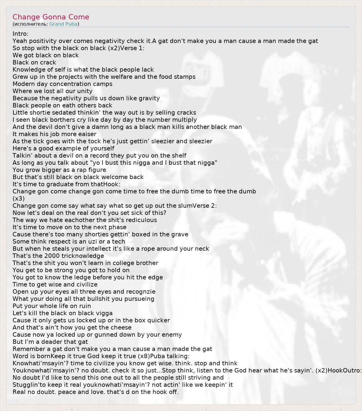 Intro: Yeah positivity over comes negativity check it.A gat don't make you a man cause a man made the gat So stop with the black on black (x2)Verse 1: We got black on black Black on crack Knowledge of self is what the black people lack Grew up in the projects with the welfare and the food stamps Modern day concentration camps Where we lost all our unity Because the negativity pulls us down like gravity Black people on eath others back Little shortie sedated thinkin' the way out is by selling cracks I seen black borthers cry like day by day the number multiply And the devil don't give a damn long as a black man kills another black man It makes his job more eaiser As the tick goes with the tock he's just gettin' sleezier and sleezier Here's a good example of yourself Talkin' about a devil on a record they put you on the shelf As long as you talk about "yo I bust this nigga and I bust that nigga" You grow bigger as a rap figure But that's still black on black welcome back It's time to graduate from thatHook: Change gon come change gon come time to free the dumb time to free the dumb (x3) Change gon come say what say what so get up out the slumVerse 2: Now let's deal on the real don't you set sick of this? The way we hate eachother the shit's rediculous It's time to move on to the next phase Cause there's too many shorties gettin' boxed in the grave Some think respect is an uzi or a tech But when he steals your intellect it's like a rope around your neck That's the 2000 tricknowledge That's the shit you won't learn in college brother You get to be strong you got to hold on You got to know the ledge before you hit the edge Time to get wise and civilize Open up your eyes all three eyes and recognzie What your doing all that bullshit you pursueing Put your whole life on ruin Let's kill the black on black vigga Cause it only gets us locked up or in the box quicker And that's ain't how you get the cheese Cause now ya locked up or gunned down by your enemy But I'm a deader that gat Remember a gat don't make you a man cause a man made the gat Word is bornKeep it true God keep it true (x8)Puba talking: Knowhati'msayin'? time to civilize you know get wise. think. stop and think Youknowhati'msayin'? no doubt. check it so just...Stop think, listen to the God hear what he's sayin'. (x2)HookOutro: No doubt I'd like to send this one out to all the people still striving and Stugglin'to keep it real youknowhati'msayin'? not actin' like we keepin' it Real no doubt. peace and love. that's d on the hook off.