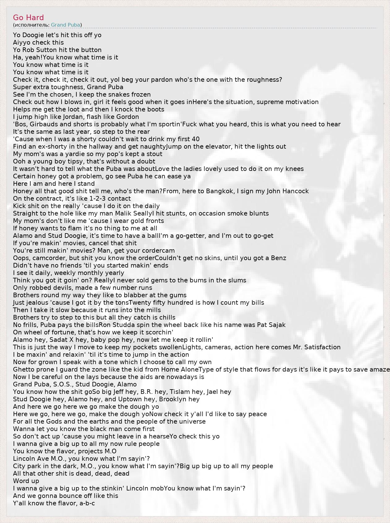 Yo Doogie let's hit this off yo Aiyyo check this Yo Rob Sutton hit the button Ha, yeah!You know what time is it You know what time is it You know what time is it Check it, check it, check it out, yoI beg your pardon who's the one with the roughness? Super extra toughness, Grand Puba See I'm the chosen, I keep the snakes frozen Check out how I blows in, girl it feels good when it goes inHere's the situation, supreme motivation Helps me get the loot and then I knock the boots I jump high like Jordan, flash like Gordon 'Bos, Girbauds and shorts is probably what I'm sportin'Fuck what you heard, this is what you need to hear It's the same as last year, so step to the rear 'Cause when I was a shorty couldn't wait to drink my first 40 Find an ex-shorty in the hallway and get naughtyJump on the elevator, hit the lights out My mom's was a yardie so my pop's kept a stout Ooh a young boy tipsy, that's without a doubt It wasn't hard to tell what the Puba was aboutLove the ladies lovely used to do it on my knees Certain honey got a problem, go see Puba he can ease ya Here I am and here I stand Honey all that good shit tell me, who's the man?From, here to Bangkok, I sign my John Hancock On the contract, it's like 1-2-3 contact Kick shit on the really 'cause I do it on the daily Straight to the hole like my man Malik SeallyI hit stunts, on occasion smoke blunts My mom's don't like me 'cause I wear gold fronts If honey wants to flam it's no thing to me at all Alamo and Stud Doogie, it's time to have a ballI'm a go-getter, and I'm out to go-get If you're makin' movies, cancel that shit You're still makin' movies? Man, get your cordercam Oops, camcorder, but shit you know the orderCouldn't get no skins, until you got a Benz Didn't have no friends 'til you started makin' ends I see it daily, weekly monthly yearly Think you got it goin' on? ReallyI never sold gems to the bums in the slums Only robbed devils, made a few number runs Brothers round my way they like to blabber at the gums Just jealous 'cause I got it by the tonsTwenty fifty hundred is how I count my bills Then I take it slow because it runs into the mills Brothers try to step to this but all they catch is chills No frills, Puba pays the billsRon Studda spin the wheel back like his name was Pat Sajak On wheel of fortune, that's how we keep it scorchin' Alamo hey, Sadat X hey, baby pop hey, now let me keep it rollin' This is just the way I move to keep my pockets swollenLights, cameras, action here comes Mr. Satisfaction I be maxin' and relaxin' 'til it's time to jump in the action Now for grown I speak with a tone which I choose to call my own Ghetto prone I guard the zone like the kid from Home AloneType of style that flows for days it's like it pays to save amaze Now I be careful on the lays because the aids are nowadays is Grand Puba, S.O.S., Stud Doogie, Alamo You know how the shit goSo big Jeff hey, B.R. hey, Tislam hey, Jael hey Stud Doogie hey, Alamo hey, and Uptown hey, Brooklyn hey And here we go here we go make the dough yo Here we go, here we go, make the dough yoNow check it y'all I'd like to say peace For all the Gods and the earths and the people of the universe Wanna let you know the black man come first So don't act up 'cause you might leave in a hearseYo check this yo I wanna give a big up to all my now rule people You know the flavor, projects M.O Lincoln Ave M.O., you know what I'm sayin'? City park in the dark, M.O., you know what I'm sayin'?Big up big up to all my people All that other shit is dead, dead, dead Word up I wanna give a big up to the stinkin' Lincoln mobYou know what I'm sayin'? And we gonna bounce off like this Y'all know the flavor, a-b-c