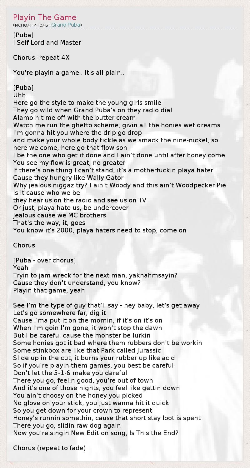 [Puba] I Self Lord and Master Chorus: repeat 4X You're playin a game.. it's all plain.. [Puba] Uhh Here go the style to make the young girls smile They go wild when Grand Puba's on they radio dial Alamo hit me off with the butter cream Watch me run the ghetto scheme, givin all the honies wet dreams I'm gonna hit you where the drip go drop and make your whole body tickle as we smack the nine-nickel, so here we come, here go that flow son I be the one who get it done and I ain't done until after honey come You see my flow is great, no greater If there's one thing I can't stand, it's a motherfuckin playa hater Cause they hungry like Wally Gator Why jealous niggaz try? I ain't Woody and this ain't Woodpecker Pie Is it cause who we be they hear us on the radio and see us on TV Or just, playa hate us, be undercover Jealous cause we MC brothers That's the way, it, goes You know it's 2000, playa haters need to stop, come on Chorus [Puba - over chorus] Yeah Tryin to jam wreck for the next man, yaknahmsayin? Cause they don't understand, you know? Playin that game, yeah See I'm the type of guy that'll say - hey baby, let's get away Let's go somewhere far, dig it Cause I'ma put it on the mornin, if it's on it's on When I'm goin I'm gone, it won't stop the dawn But I be careful cause the monster be lurkin Some honies got it bad where them rubbers don't be workin Some stinkbox are like that Park called Jurassic Slide up in the cut, it burns your rubber up like acid So if you're playin them games, you best be careful Don't let the 5-1-6 make you dareful There you go, feelin good, you're out of town And it's one of those nights, you feel like gettin down You ain't choosy on the honey you picked No glove on your stick, you just wanna hit it quick So you get down for your crown to represent Honey's runnin somethin, cause that short stay loot is spent There you go, slidin raw dog again Now you're singin New Edition song, Is This the End? Chorus (repeat to fade)