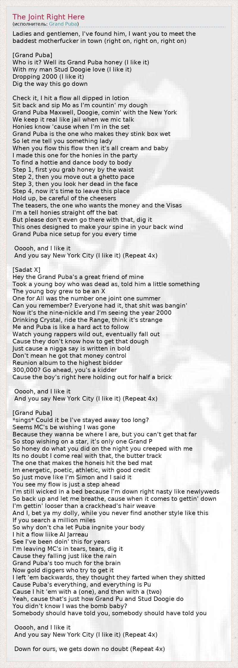 And you say New York City (I like it) (Repeat 4x)