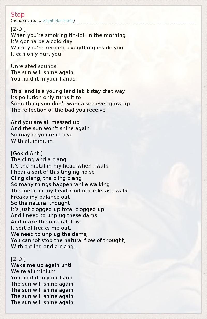 [2-D:] Когда ты утром закуриваешь через фольгу, Значит, будет холодный день. Когда ты держишь всё внутри себя, Это может только навредить тебе. Посторонние звуки... Солнце вновь засияет, Ты держишь его в своих руках. Этот мир - молодой, и пусть таким и остаётся. Грязь в нём превращает его в Нечто, развитие чего тебе вряд ли когда-нибудь захотелось увидеть. До тебя доходит отражение плохого. Ты налажал по полной, Солнце больше не засияет. Так, может, ты влюблён В алюминий? [Gokid Ant:] Прицепилось и звенит - Это металл в моей голове. Когда я иду, Я слышу шум, какое-то дзиньканье: Прицепилось и дребезжит - цап-бряц! Пока я иду, так много всего происходит. Металл в моей голове как бы звякает по мере ходьбы, Выводит меня из себя. 1 Так что естественная при этом мысль - Внутри всё закупорилось, капитально засорилось. И мне нужно разрушить эти плотины И дать ход естественному потоку. Это немного выбешивает меня, Нам нужно разрушить плотины. Ты не сможешь остановить естественный поток мыслей, Цапаньем и бряцаньем. [2-D:] Разбуди меня, пока Мы алюминиевые. Ты держишь его в своих руках - Солнце вновь засияет, Солнце вновь засияет, Солнце вновь засияет, Солнце вновь засияет... 1 - дословно: нарушает моё равновесие