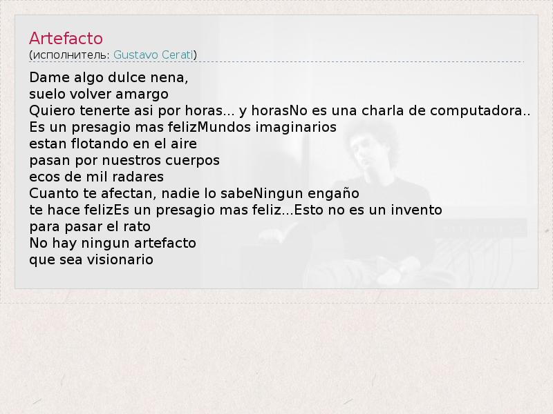 Это интересно:Gustavo Adrián Cerati Clark - Густаво Серати (родился в Буэнос-Айресе, 11 августа 1959 года). Аргентинский певец, композитор и гитарист. В 80-90-ые годы входил в состав известной аргентинской рок-группы Soda Stereo, вместе с Чарли Альберти (Charly Alberti) и Зета Босио (Zeta Bosio). После распада группы начал сольную карьеру с дебютным альбомом "Amor Amarillo" (в записи заглавного трека принял участие и Hector (Zeta)... продолжение