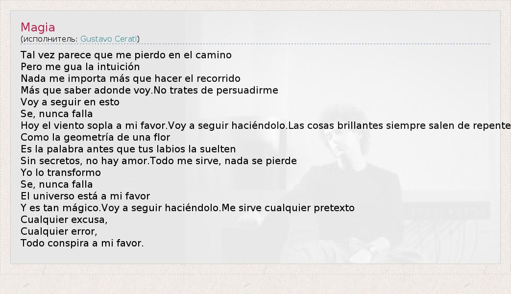 Это интересно:Gustavo Adrián Cerati Clark - Густаво Серати (родился в Буэнос-Айресе, 11 августа 1959 года). Аргентинский певец, композитор и гитарист. В 80-90-ые годы входил в состав известной аргентинской рок-группы Soda Stereo, вместе с Чарли Альберти (Charly Alberti) и Зета Босио (Zeta Bosio). После распада группы начал сольную карьеру с дебютным альбомом "Amor Amarillo" (в записи заглавного трека принял участие и Hector (Zeta)... продолжение