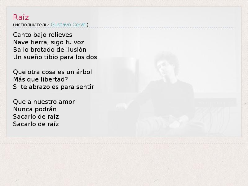 Это интересно:Gustavo Adrián Cerati Clark - Густаво Серати (родился в Буэнос-Айресе, 11 августа 1959 года). Аргентинский певец, композитор и гитарист. В 80-90-ые годы входил в состав известной аргентинской рок-группы Soda Stereo, вместе с Чарли Альберти (Charly Alberti) и Зета Босио (Zeta Bosio). После распада группы начал сольную карьеру с дебютным альбомом "Amor Amarillo" (в записи заглавного трека принял участие и Hector (Zeta)... продолжение