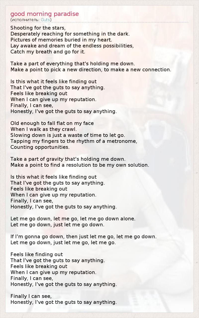 Shooting for the stars, Desperately reaching for something in the dark. Pictures of memories buried in my heart. Lay awake and dream of the endless possibilities, Catch my breath and go for it. Take a part of everything that's holding me down. Make a point to pick a new direction, to make a new connection. Is this what it feels like finding out That I've got the guts to say anything. Feels like breaking out When I can give up my reputation. Finally, I can see, Honestly, I've got the guts to say anything. Old enough to fall flat on my face When I walk as they crawl. Slowing down is just a waste of time to let go. Tapping my fingers to the rhythm of a metronome, Counting opportunities. Take a part of gravity that's holding me down. Make a point to find a resolution to be my own solution. Is this what it feels like finding out That I've got the guts to say anything. Feels like breaking out When I can give up my reputation. Finally, I can see, Honestly, I've got the guts to say anything. Let me go down, let me go, let me go down alone. Let me go down, just let me go down. If I'm gonna go down, then just let me go, let me go down. Let me go down, just let me go, let me go. Feels like finding out That I've got the guts to say anything. Feels like breaking out When I can give up my reputation. Finally, I can see, Honestly, I've got the guts to say anything. Finally I can see, Honestly, I've got the guts to say anything.