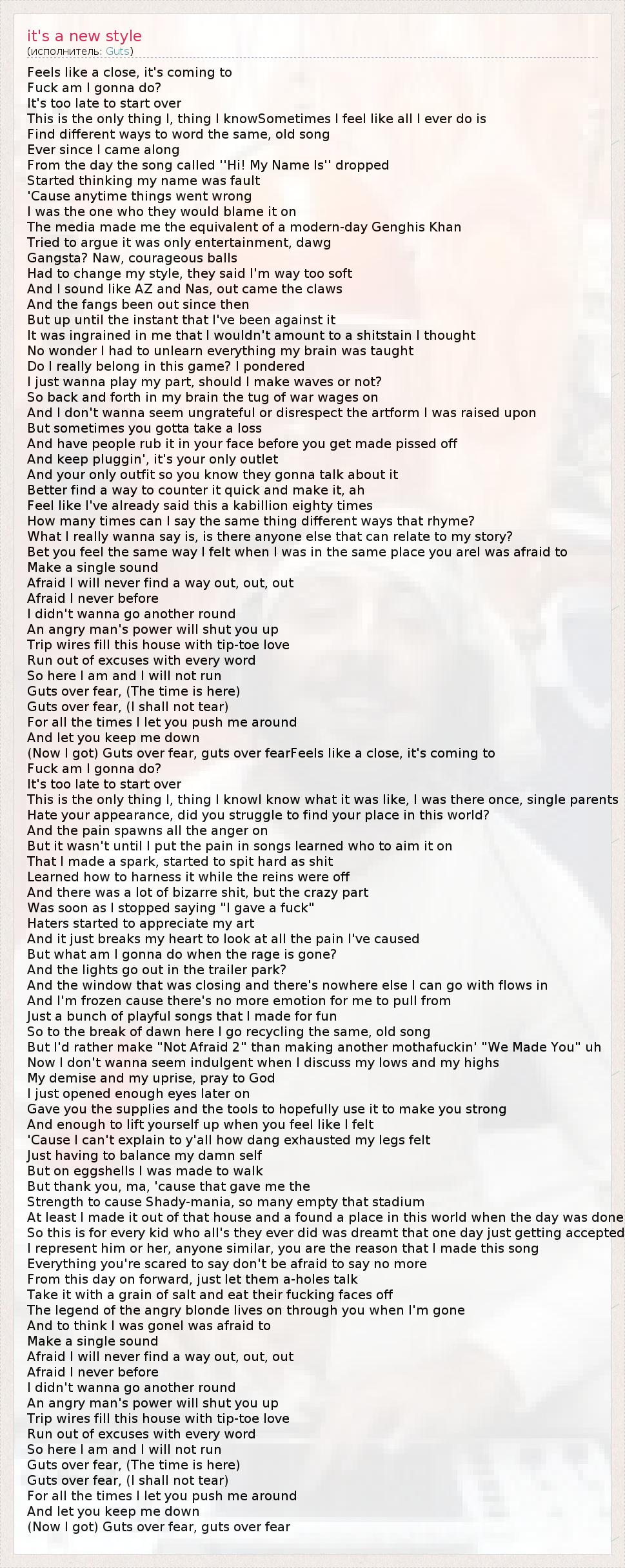 Feels like a close, it's coming to Fuck am I gonna do? It's too late to start over This is the only thing I, thing I knowSometimes I feel like all I ever do is Find different ways to word the same, old song Ever since I came along From the day the song called ''Hi! My Name Is'' dropped Started thinking my name was fault 'Cause anytime things went wrong I was the one who they would blame it on The media made me the equivalent of a modern-day Genghis Khan Tried to argue it was only entertainment, dawg Gangsta? Naw, courageous balls Had to change my style, they said I'm way too soft And I sound like AZ and Nas, out came the claws And the fangs been out since then But up until the instant that I've been against it It was ingrained in me that I wouldn't amount to a shitstain I thought No wonder I had to unlearn everything my brain was taught Do I really belong in this game? I pondered I just wanna play my part, should I make waves or not? So back and forth in my brain the tug of war wages on And I don't wanna seem ungrateful or disrespect the artform I was raised upon But sometimes you gotta take a loss And have people rub it in your face before you get made pissed off And keep pluggin', it's your only outlet And your only outfit so you know they gonna talk about it Better find a way to counter it quick and make it, ah Feel like I've already said this a kabillion eighty times How many times can I say the same thing different ways that rhyme? What I really wanna say is, is there anyone else that can relate to my story? Bet you feel the same way I felt when I was in the same place you areI was afraid to Make a single sound Afraid I will never find a way out, out, out Afraid I never before I didn't wanna go another round An angry man's power will shut you up Trip wires fill this house with tip-toe love Run out of excuses with every word So here I am and I will not run Guts over fear, (The time is here) Guts over fear, (I shall not tear) For all the times I let you push me around And let you keep me down (Now I got) Guts over fear, guts over fearFeels like a close, it's coming to Fuck am I gonna do? It's too late to start over This is the only thing I, thing I knowI know what it was like, I was there once, single parents Hate your appearance, did you struggle to find your place in this world? And the pain spawns all the anger on But it wasn't until I put the pain in songs learned who to aim it on That I made a spark, started to spit hard as shit Learned how to harness it while the reins were off And there was a lot of bizarre shit, but the crazy part Was soon as I stopped saying "I gave a fuck" Haters started to appreciate my art And it just breaks my heart to look at all the pain I've caused But what am I gonna do when the rage is gone? And the lights go out in the trailer park? And the window that was closing and there's nowhere else I can go with flows in And I'm frozen cause there's no more emotion for me to pull from Just a bunch of playful songs that I made for fun So to the break of dawn here I go recycling the same, old song But I'd rather make "Not Afraid 2" than making another mothafuckin' "We Made You" uh Now I don't wanna seem indulgent when I discuss my lows and my highs My demise and my uprise, pray to God I just opened enough eyes later on Gave you the supplies and the tools to hopefully use it to make you strong And enough to lift yourself up when you feel like I felt 'Cause I can't explain to y'all how dang exhausted my legs felt Just having to balance my damn self But on eggshells I was made to walk But thank you, ma, 'cause that gave me the Strength to cause Shady-mania, so many empty that stadium At least I made it out of that house and a found a place in this world when the day was done So this is for every kid who all's they ever did was dreamt that one day just getting accepted I represent him or her, anyone similar, you are the reason that I made this song Everything you're scared to say don't be afraid to say no more From this day on forward, just let them a-holes talk Take it with a grain of salt and eat their fucking faces off The legend of the angry blonde lives on through you when I'm gone And to think I was goneI was afraid to Make a single sound Afraid I will never find a way out, out, out Afraid I never before I didn't wanna go another round An angry man's power will shut you up Trip wires fill this house with tip-toe love Run out of excuses with every word So here I am and I will not run Guts over fear, (The time is here) Guts over fear, (I shall not tear) For all the times I let you push me around And let you keep me down (Now I got) Guts over fear, guts over fear