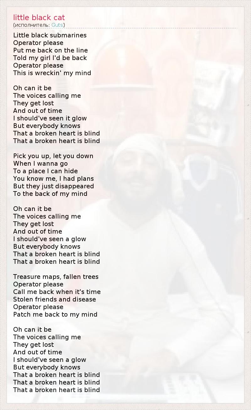 Little black submarines Operator please Put me back on the line Told my girl I'd be back Operator please This is wreckin' my mind Oh can it be The voices calling me They get lost And out of time I should've seen it glow But everybody knows That a broken heart is blind That a broken heart is blind Pick you up, let you down When I wanna go To a place I can hide You know me, I had plans But they just disappeared To the back of my mind Oh can it be The voices calling me They get lost And out of time I should've seen a glow But everybody knows That a broken heart is blind That a broken heart is blind Treasure maps, fallen trees Operator please Call me back when it's time Stolen friends and disease Operator please Patch me back to my mind Oh can it be The voices calling me They get lost And out of time I should've seen a glow But everybody knows That a broken heart is blind That a broken heart is blind That a broken heart is blind