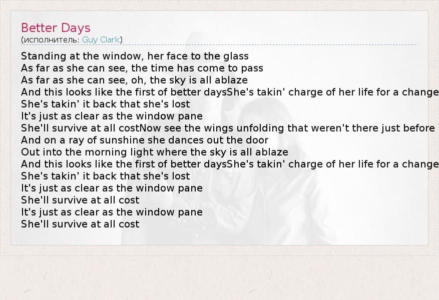 And this looks like the first of better daysShe's takin' charge of her life for a change