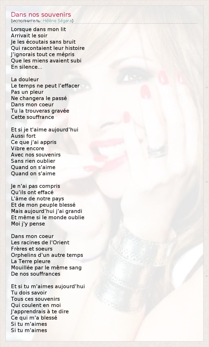 Когда в мою кровать Приходил вечер Я тихо слушала, Как они рассказывают свою историю Я не знала обо всём том презрении, Которому подвергались мои родные, Молча… Время не может стереть Боль Ни одна слеза Не изменит прошлое В моём сердце Ты найдёшь запечатлённым Это страдание И если я люблю тебя сегодня Так сильно То, что я узнала, Ещё дрожит Вместе с нашими воспоминаниями, Ничего не забывая, Когда мы любим друг друга Когда мы любим друг друга Я не поняла, Что они стёрли Душу нашей страны И моего оскорблённого народа, Но сейчас я выросла И, хотя мир забывает, Я думаю об этом В моём сердце Корни Востока Братья и сёстры, Сироты из другого времени, Земля плачет, Омытая той же кровью Наших страданий И если ты любишь меня сегодня, Ты должен знать – Все эти воспоминания, Которые текут во мне, Я научусь говорить тебе То, что меня ранило, Если ты любишь меня Если ты любишь меня