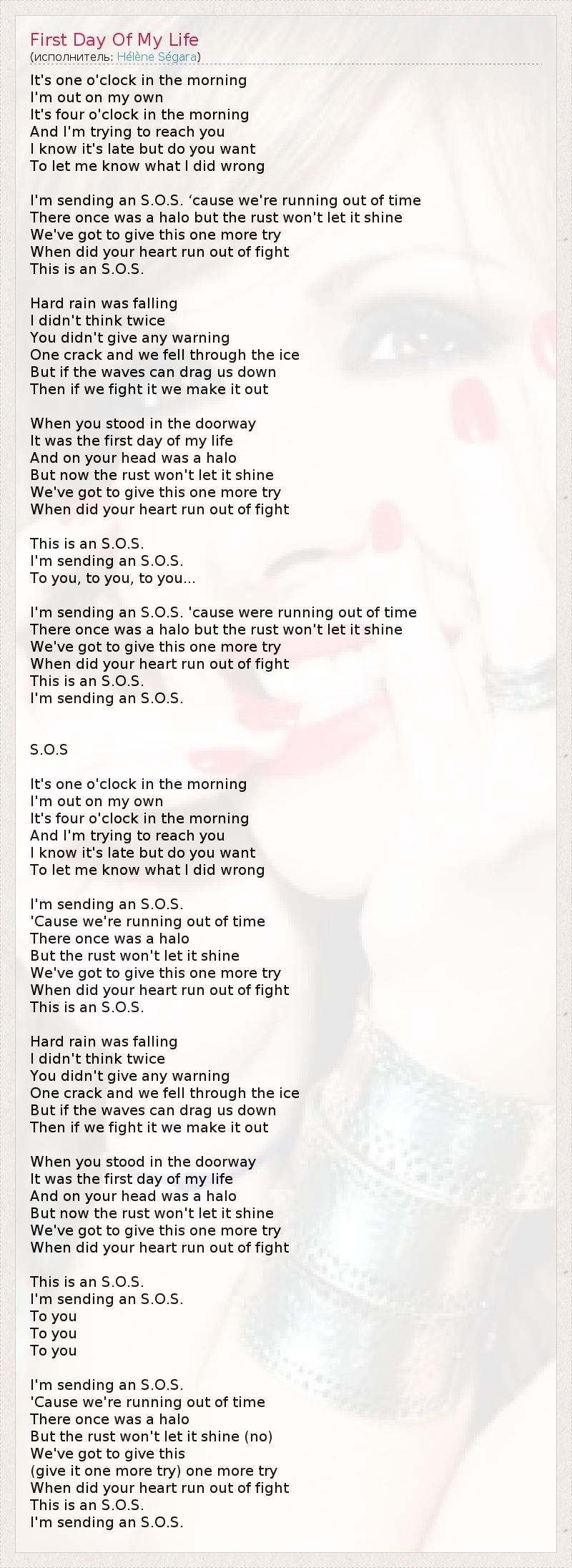 Час ночи, Я сам по себе. Четыре часа утра, И я пытаюсь достучаться тебя. Я знаю, уже поздно, но не хочешь ли ты Дать мне знать, что я сделал не так? Я шлю сигнал бедствия, потому что у нас заканчивается время. Когда-то над тобой светил нимб, но теперь он заржавел. Мы должны дать нам ещё один шанс. Когда твоё сердце перестало бороться? Это сигнал бедствия. Шёл проливной дождь, Я не думал дважды. Ты ничего не сказала, Одна трещина - и мы ушли под лёд. Но если волны могут ослабить нас, То мы справимся, поборов это. Когда ты стояла в дверях, Это был первый день моей жизни. Над твоей головой сиял нимб, Но сейчас он заржавел. Мы должны дать нам ещё один шанс. Когда твоё сердце перестало бороться? Это сигнал бедствия, Я посылаю сигнал бедствия, Тебе, тебе, тебе... Я шлю сигнал бедствия, потому что у нас заканчивается время. Когда-то над тобой светил нимб, но теперь он заржавел. Мы должны дать нам ещё один шанс. Когда твоё сердце перестало бороться? Это сигнал бедствия. Я посылаю сигнал бедствия. S.O.S (перевод Александра из Санкт-Петербурга) Уже час ночи, Я один. Четыре часа утра, И я пытаюсь достучаться до тебя. Я знаю, что уже поздно, но вдруг Ты захочешь расссказать, что же я сделал не так. Я отправляю S.O.S, Потому что у нас нет времени Когда-то здесь было сияние, Но теперь тлен мешает ему. Мы должны дать ему ещё один шанс, Когда твоё сердце устанет от сражения. Это S.O.S. Лил дождь, Я не думаю дважды Без всяких предупреждений, Толчок - и вот мы падаём сквозь лёд, Но если волны могут нас вынести, Тогда стоит сражаться за это. Когда ты появилась на пороге, Был первый день моей жизни. Над твоей головой был нимб, Но сейчас тлен мешает ему сиять. Нам нужен ещё один шанс, Когда твоё сердце устанет сражаться. Это S.O.S Я отправляю S.O.S Тебе Тебе Тебе Я отправляю S.O.S, Потому что у нас нет времени Когда-то здесь был нимб, Но сейчас тлен не даёт ему сиять (нет) Нам нужен ещё один (нужно дать ещё один шанс) шанс Когда твоё сердце устанет сражаться Это S.O.S Я отправляю S.O.S