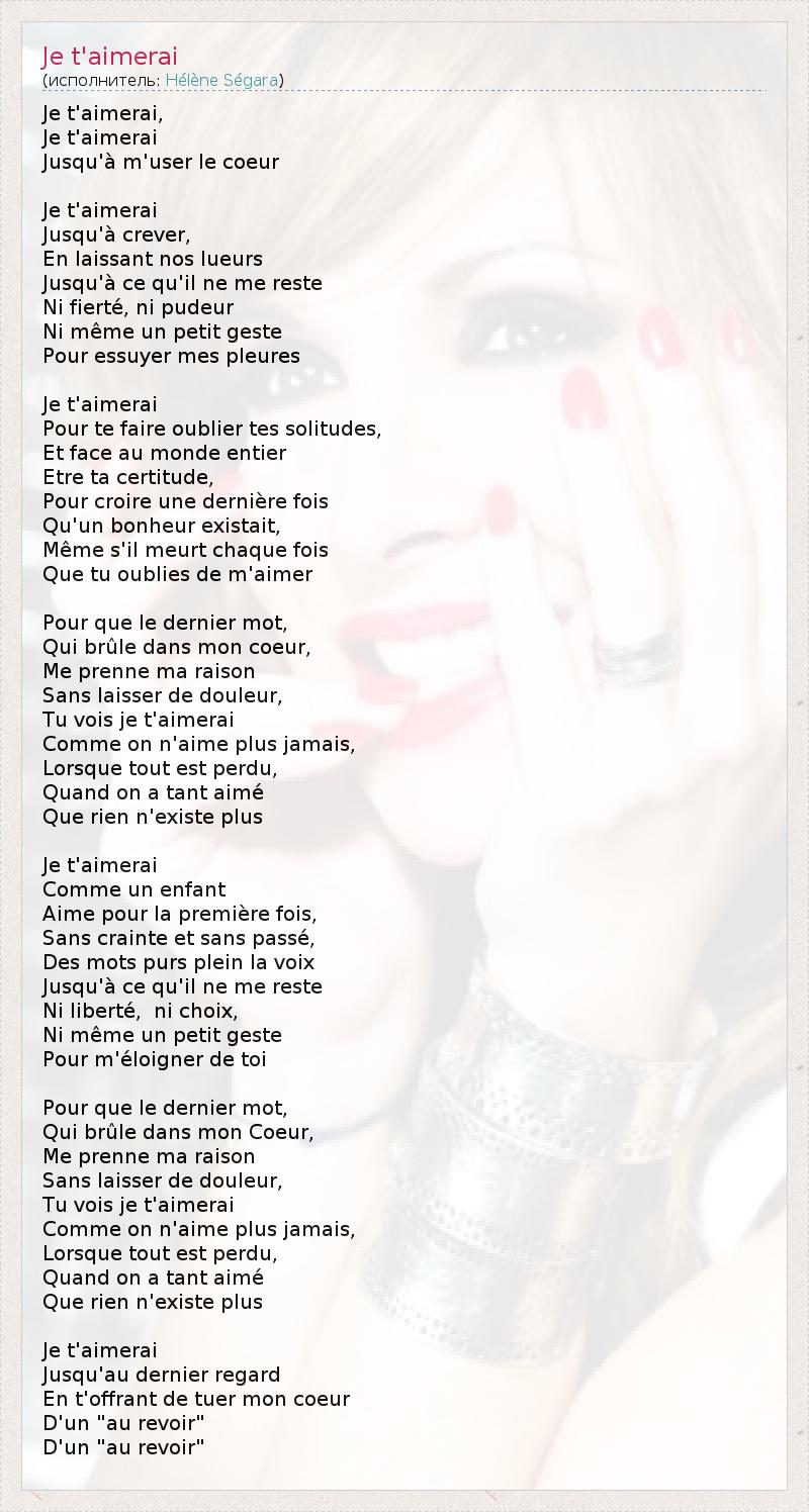 Je t'aimerai, Je t'aimerai Jusqu'à m'user le coeur Je t'aimerai Jusqu'à crever, En laissant nos lueurs Jusqu'à ce qu'il ne me reste Ni fierté, ni pudeur Ni même un petit geste Pour essuyer mes pleures Je t'aimerai Pour te faire oublier tes solitudes, Et face au monde entier Etre ta certitude, Pour croire une dernière fois Qu'un bonheur existait, Même s'il meurt chaque fois Que tu oublies de m'aimer Pour que le dernier mot, Qui brûle dans mon coeur, Me prenne ma raison Sans laisser de douleur, Tu vois je t'aimerai Comme on n'aime plus jamais, Lorsque tout est perdu, Quand on a tant aimé Que rien n'existe plus Je t'aimerai Comme un enfant Aime pour la première fois, Sans crainte et sans passé, Des mots purs plein la voix Jusqu'à ce qu'il ne me reste Ni liberté, ni choix, Ni même un petit geste Pour m'éloigner de toi Pour que le dernier mot, Qui brûle dans mon Coeur, Me prenne ma raison Sans laisser de douleur, Tu vois je t'aimerai Comme on n'aime plus jamais, Lorsque tout est perdu, Quand on a tant aimé Que rien n'existe plus Je t'aimerai Jusqu'au dernier regard En t'offrant de tuer mon coeur D'un "au revoir" D'un "au revoir"