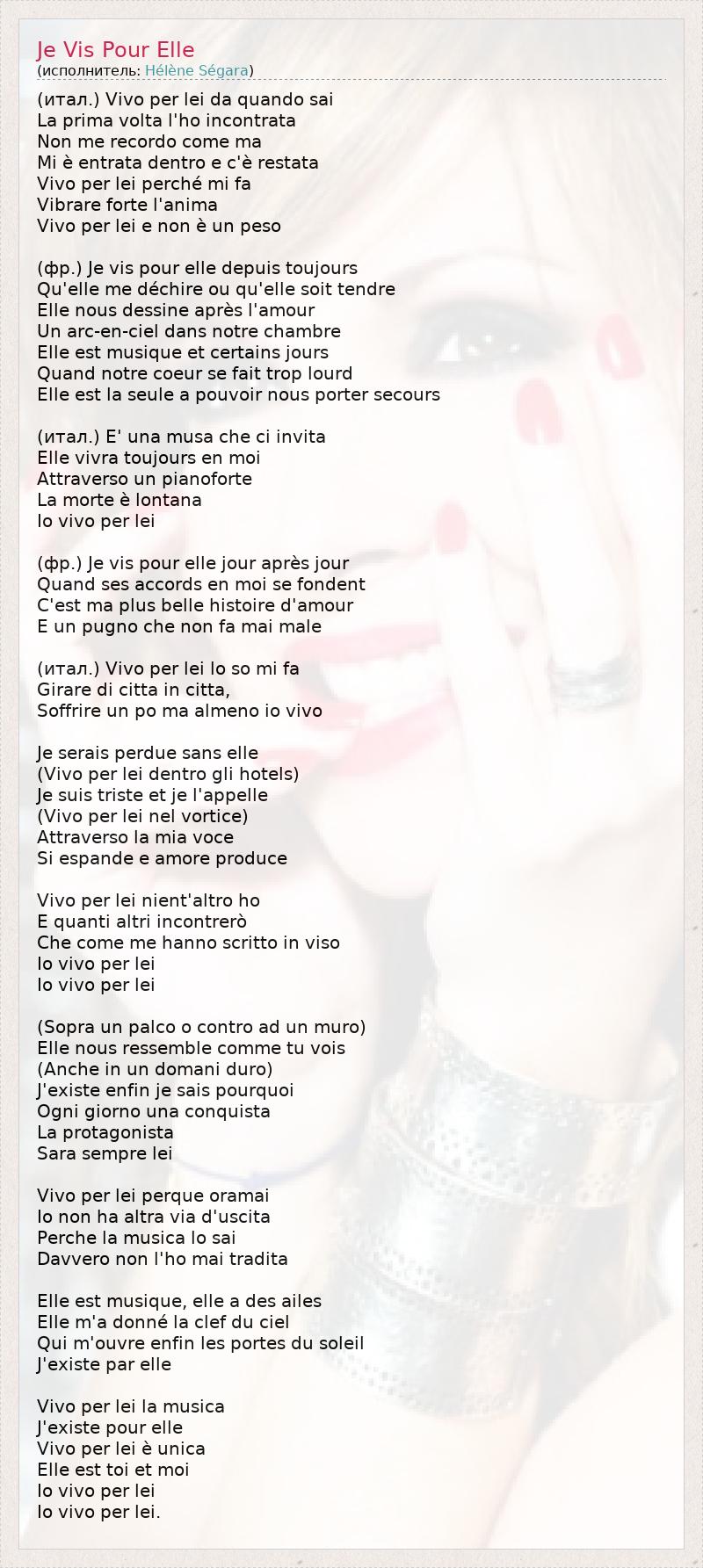 (итал.) Vivo per lei da quando sai La prima volta l'ho incontrata Non me recordo come ma Mi è entrata dentro e c'è restata Vivo per lei perché mi fa Vibrare forte l'anima Vivo per lei e non è un peso (фр.) Je vis pour elle depuis toujours Qu'elle me déchire ou qu'elle soit tendre Elle nous dessine après l'amour Un arc-en-ciel dans notre chambre Elle est musique et certains jours Quand notre coeur se fait trop lourd Elle est la seule а pouvoir nous porter secours (итал.) E' una musa che ci invita Elle vivra toujours en moi Attraverso un pianoforte La morte è lontana Io vivo per lei (фр.) Je vis pour elle jour après jour Quand ses accords en moi se fondent C'est ma plus belle histoire d'amour E un pugno che non fa mai male (итал.) Vivo per lei lo so mi fa Girare di citta in citta, Soffrire un po ma almeno io vivo Je serais perdue sans elle (Vivo per lei dentro gli hotels) Je suis triste et je l'appelle (Vivo per lei nel vorticе) Attraverso la mia voce Si espande e amore produce Vivo per lei nient'altro ho E quanti altri incontrerò Che come me hanno scritto in viso Io vivo per lei Io vivo per lei (Sopra un palco o contro ad un muro) Elle nous ressemble comme tu vois (Anche in un domani duro) J'existe enfin je sais pourquoi Ogni giorno una conquista La protagonista Sara sempre lei Vivo per lei perque oramai Io non ha altra via d'uscita Perche la musica lo sai Davvero non l'ho mai tradita Elle est musique, elle a des ailes Elle m'a donné la clef du ciel Qui m'ouvre enfin les portes du soleil J'existe par elle Vivo per lei la musica J'existe pour elle Vivo per lei è unica Elle est toi et moi Io vivo per lei Io vivo per lei.