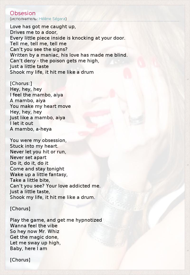 Love has got me caught up, Drives me to a door, Every little piece inside is knocking at your door. Tell me, tell me, tell me Can't you see the signs? Written by a maniac, his love has made me blind. Can't deny - the poison gets me high, Just a little taste Shook my life, it hit me like a drum [Сhorus:] Hey, hey, hey I feel the mambo, aiya A mambo, aiya You make my heart move Hey, hey, hey Just like a mambo, aiya I let it out A mambo, a-heya You were my obsession, Stuck into my heart. Never let you hit or run, Never set apart Do it, do it, do it Come and stay tonight Wake up a little fantasy, Take a little bite, Can't you see? Your love addicted me. Just a little taste, Shook my life, it hit me like a drum. [Сhorus] Play the game, and get me hypnotized Wanna feel the vibe So hey now Mr. Whiz Get the magic done, Let me sway up high, Baby, here I am [Сhorus]